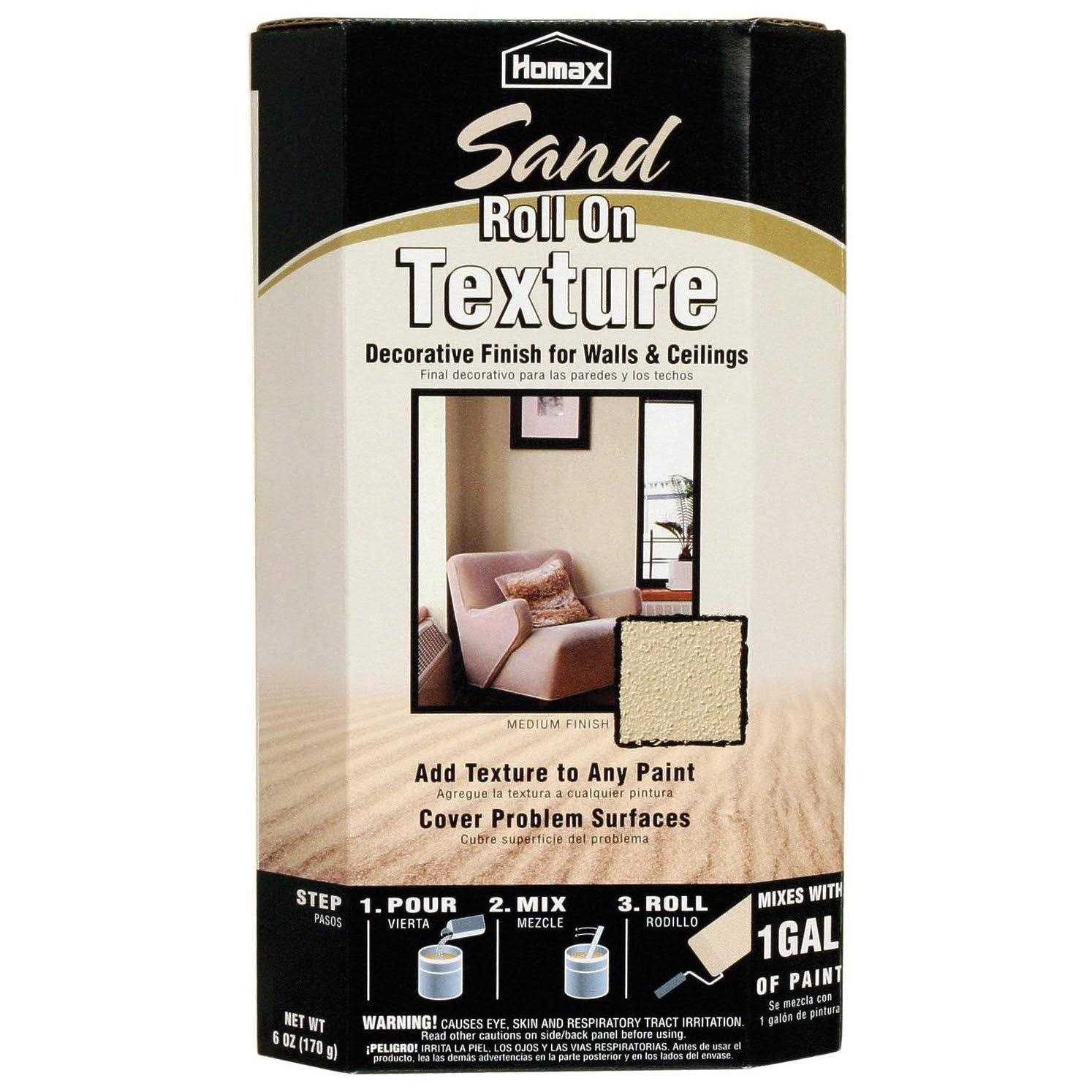 Create a subtle decorative finish on walls with Homax Sand Roll-On Paint Texture. In one step, you can cover unsightly walls and add decorative appeal. Simply mix the material with one gallon of paint and apply the texture with a conventional paint roller or textured paint roller. Give your rooms the new look youve always wanted with Homax Roll-On Paint Texture. Also available in Suede and Stone finishes.