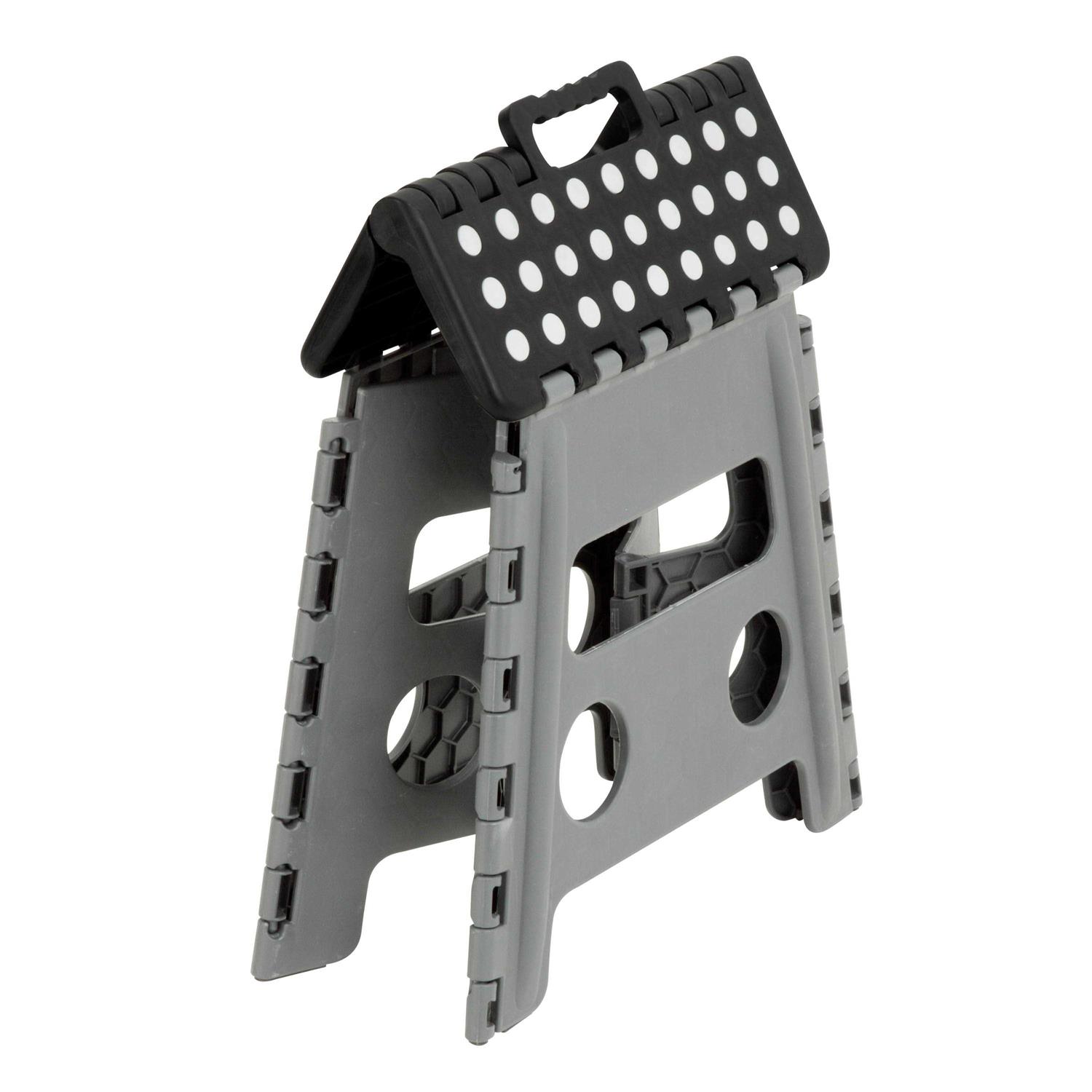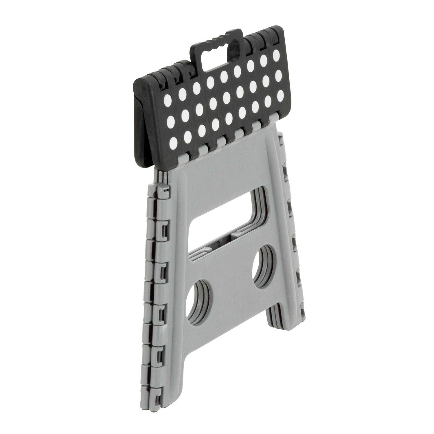 This step stool features a convenient carrying handle with skid-resistant top and feet. Sturdy design and durable plastic construction allow it to support up to 300lbs. Great for bedrooms, bathrooms and every other room in the house. Folds from a 12.75 inch H down to an easy-to-store 1.75 inch width.