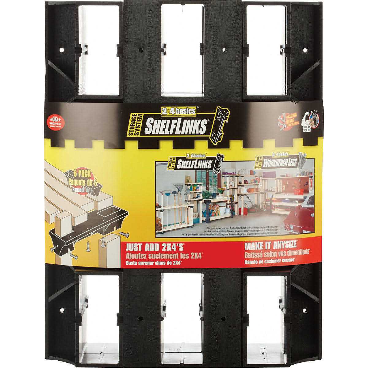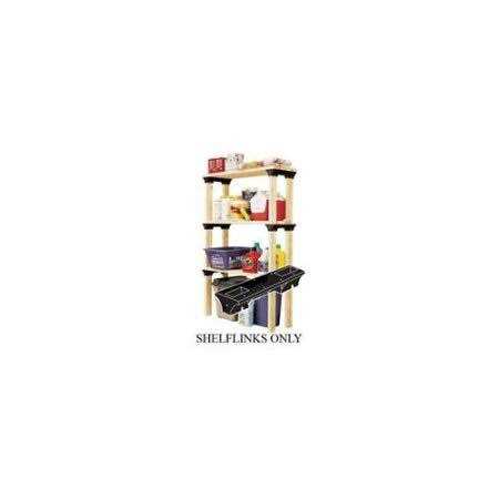 You can determine the size and configuration just add 2×4 legs to the Shelf Links to make functional and custom shelving in any length height and configuration. Made of structural resin. Can support spans up to 8 foot. Includes ShelfLinks hardware and instructions. Build your own shelving!. Just add straight cut 2x4s no miter cuts needed. All hardware included. Make it any size you want up to 8 ft long. High density resin shelf links create a sturdy shelving system for garage workshop or home.