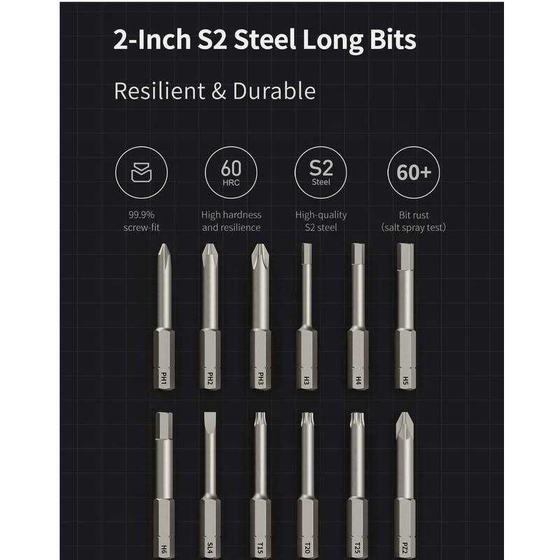 ALL-IN-ONE DESIGN: HOTO cordless screwdriver set contains 12 2-IN S2 steel long bits with hardness up to 60HRC, which are resilient, and durable. The screwdriver and 12 bits are stored in the frosted Al alloy storage box that has soft rubber top handle, creating comfortability and portability for users. MANEUVERABILITY: The screwdriver is maneuverable by screw-unscrew buttons and the circular LED shadowless lamp, which will be turned off automatically 10s after releasing the button. The lightweight of the screwdriver is 0.55lb and a double-layered soft grip made of high-strength plastic and TPE rubber enables users to operate the screwdriver using one hand. With a four-staged rotary knob and built-in intelligent chip, people can adjust the torque precisely to meet various needs. MINIMALIST BUT HIGHLY FUNCTIONAL: The 1500mAH large capacity battery, which is experienced 37 battery-related tests, provides ultra-long endurance that the screwdriver can run more than 1000 screws when it is fully charged. The high-speed magnetic motor and metallic gearbox provide strong and stable power output to the cordless screwdriver. And the universal Type-C charging interface makes the charging of the screwdriver convenient. HIGHLY RESPONSIVE: The built-in circuit board of the electric screwdriver can sense and stop the rotation as soon as the button is released, leaving no scratch or dent on the screws. And it is helpful to avoid injuring users’ fingers due to over-rotation. PACKAGE INCLUDED: 1 X 3.6 Cordless Screwdriver, 1 X 12 Bits (C6.3 x 50 mm), 1 X Aluminum storage box, 1 X Type-C Cable. Size included: Philips(PH1/PH2/PH3), Hex(H3/H4/H5/H6), Torx (T15/T20/T25),Flat blade(SL4), Pozidriv(PZ2)