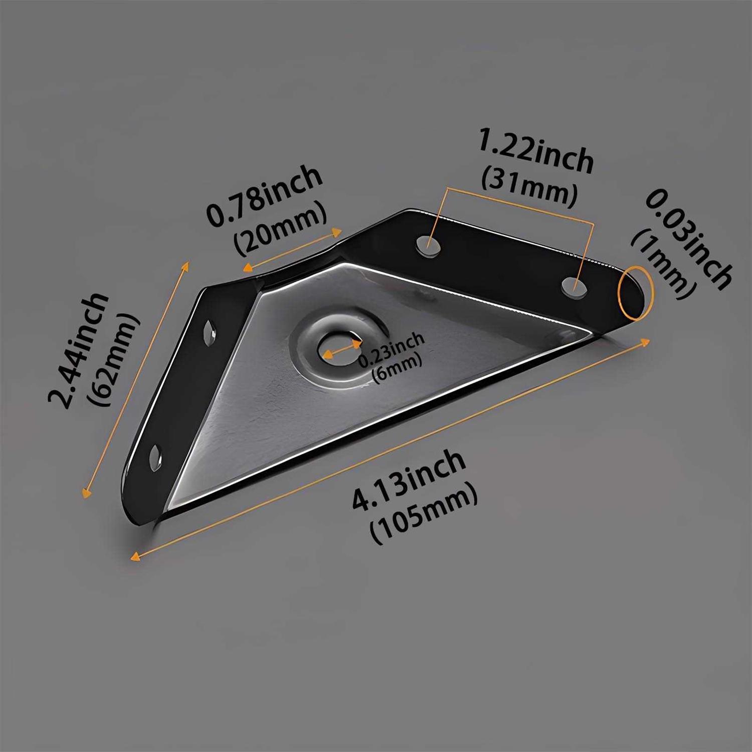 Material: Cold Rolled Steel. Size: Thickness: 1mm/0.03″, Length: 105mm/4.13″, Width: 62mm/2.44″, Hole Distance: 31mm/1.22″, Hole Diameter: 6mm/0.24″, Corner Width: 20mm/0.78″. Design: Specially designed with triangle shape, it is an important fastener to make furniture parts stay firm. Feature: The internal braces serve more as structural supports to strengthen corner joints against compressive failure. Application: Used for reinforcing inside of right angle corner joints