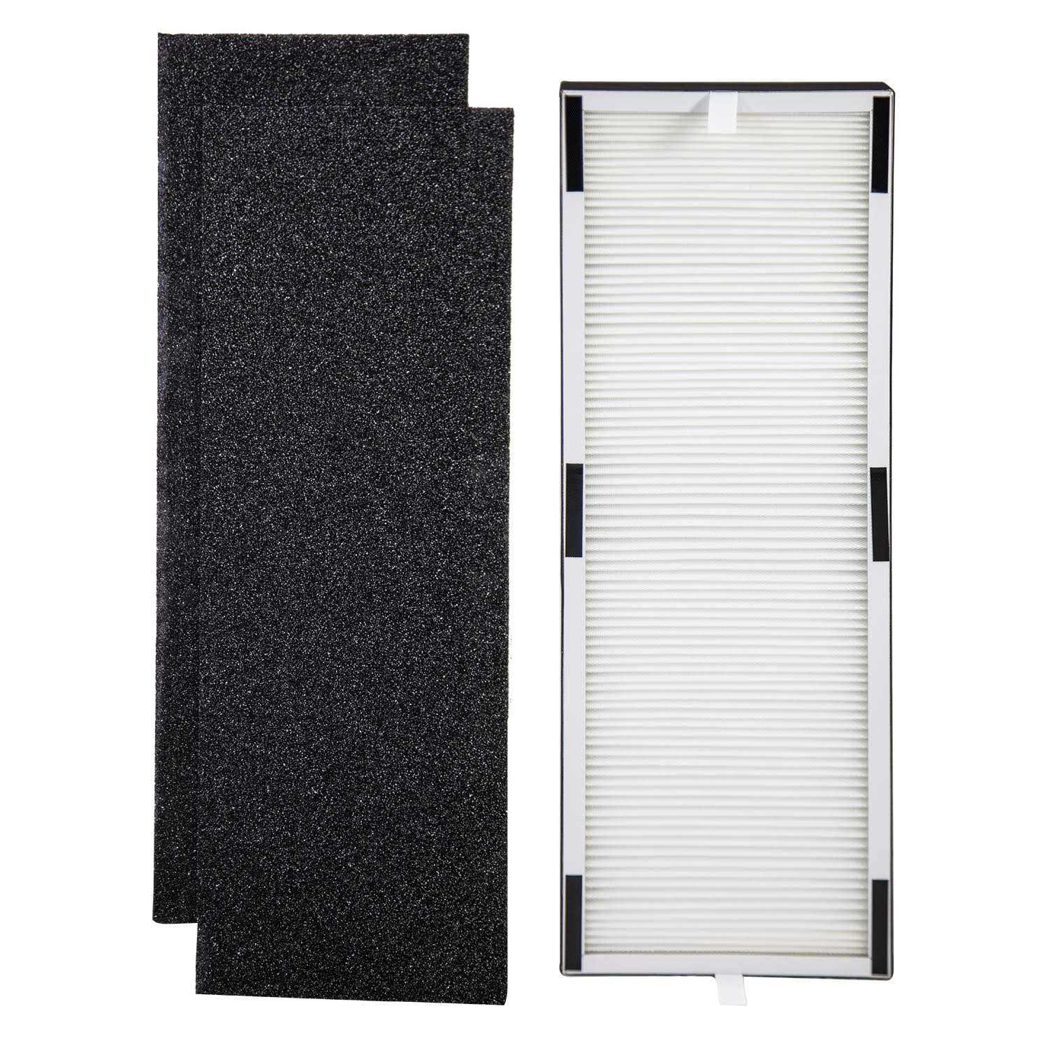 Features a Coconut Carbon pre-filter which neutralizes household odors from cooking, cleaning, smoking, and pets. The pre-filter also captures larger particles before they reach the HEPA filter which extends the life of the HEPA filter. The True HEPA filter removes 99.9% of airborne particles as small as 0.3 microns including smoke, dust, pollen, pet hair and dander, mold spores, and dust mite debris. It is recommended to replace the HEPA filter every 6 months and the pre-filter every 3 months for maximum efficiency, or more often depending on air quality and environmental factors. Package contains (1) one replacement HEPA filter and (2) two replacement pre-filters.