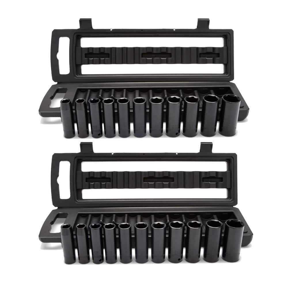 Drive Deep SAE and Metric Impact Socket Set features 22 deep 6-point impact grade sockets with a socket rail for easy storage. Husky 1/2 in. drive deep impact sockets are forged from chrome molybdenum alloy steel (Cr-Mo) and designed to withstand rigors of heavy-duty auto and industrial use. Size markings have been hard stamped into the sockets for quick and easy identification that will never wear away. These impact sockets also feature off-corner loading which helps prevent fastener rounding, plus a shallow broach design which prevents fasteners from getting lodged deep into the socket. An oiled, black oxide finish gives you maximum corrosion resistance.”