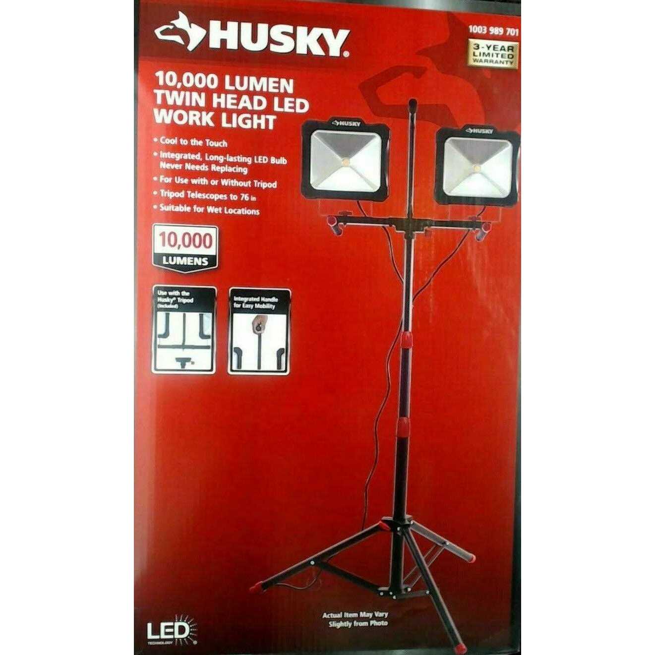 Provides ample LED lighting to illuminate your work surroundings Versatile design can be used with or without tripod Easy-grip handle allows for easy transport The Husky 10,000-Lumen Twin Head LED Work Light is versatile and can be br / used with or without the tripod. It provides ample lighting with its br / long-lasting LED bulb. Once detached from the tripod, its easy grip handle br / also allows it to be transported with ease.