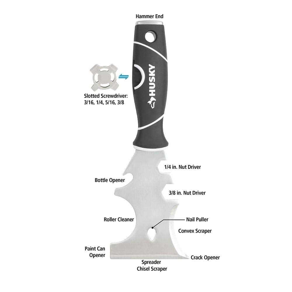 The Husky 15-in-1 Painter’s Tool combines a spreader, a chisel scraper, a paint can opener, a roller cleaner, a nail puller, several Philips screwdrivers and many other functions, giving you the versatility of a painter’s tool box in 1 design. The tool is made of steel to provide long-lasting strength. A must to have tool in painter’s tool bag. Age Group: adult.