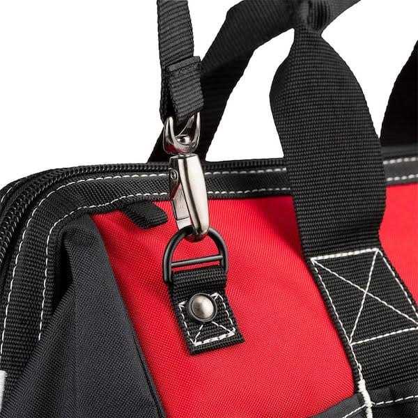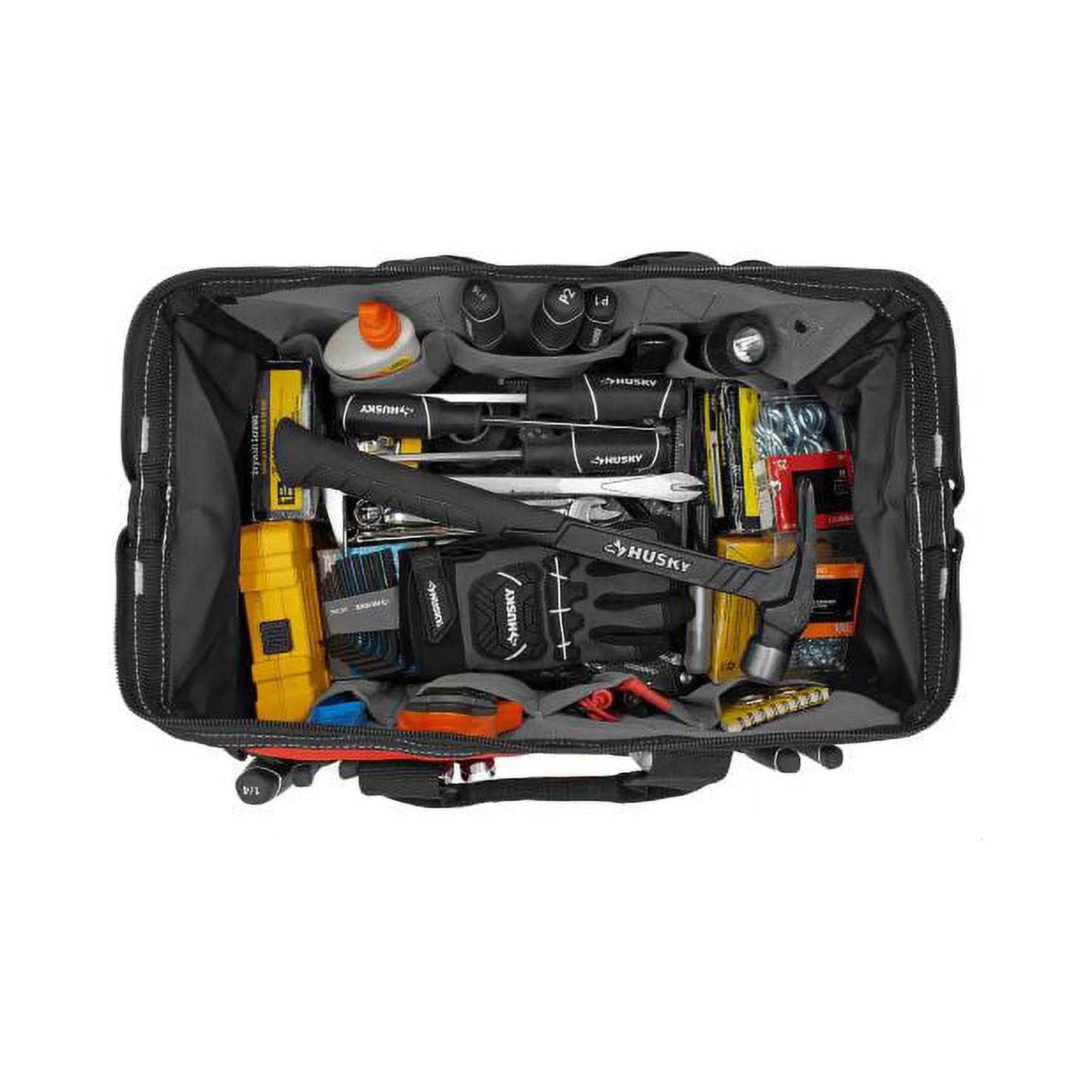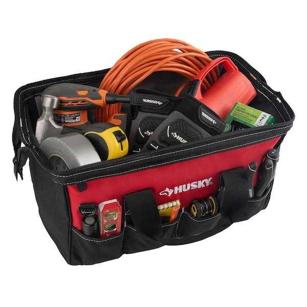 Tool Bag is constructed of 600 denier, water-resistant material and includes 14 large pockets. This tool bag has a wide mouth opening with dual zipper top for easier access to interior. Large main compartment for larger tool storage. Use the Husky 18 inch tool bag with your Husky tool pouches. Color: Red/Black.
