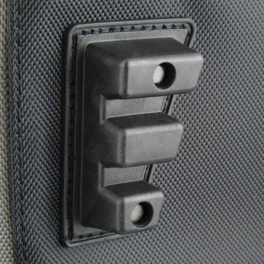 Pro Tool Tote includes a removable tool wall and rotating padded handle for easy tool access. The outside of the tote is constructed of heavy-duty 1680D fabric with full reinforced edges for durability and features a hard-sided pocket to store valuables. Also included is a lockable security zipper for theft prevention, easy-access tape clip, 16 in. hand saw pocket, level holder, electrical tape strap and padded shoulder strap.