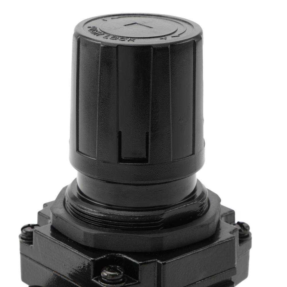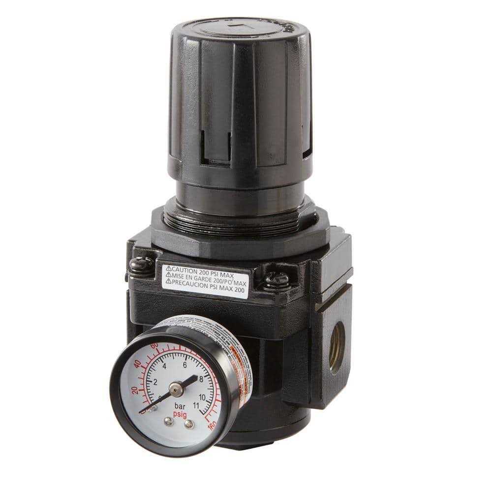 Get twice the airflow for your projects with the Husky 3/8 in. This durable regulator provides output pressure of 0 psi to 150 psi for proper tool operation. It also provides twice the air flow compared to other standard regulators. The user friendly design makes for easy operation; just pull to adjust and push to lock the adjustment knob. NPT (F) Ports and a maximum inlet pressure of 200 psi.