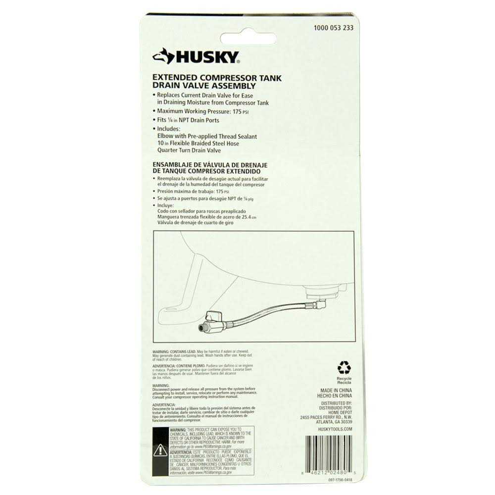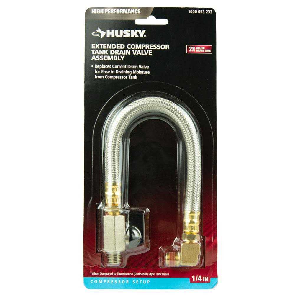 Works on air compressors with 1/4 in. NPT drain valve Replaces current drain valve for ease in draining moisture from the compressor tank Includes a 1/4 in. elbow with pre-applied thread sealant, 10 in. flexible braided steel hose and 1/4 in. quarter turn drain valve Easily drain your tank after every use Fits 1/4 in. NPT ports The key to a long lasting air compressor is regular maintenance. Each time your compressor runs, the moisture in the air condenses in the tank. This moisture must be drained daily from the tank to prevent water buildup. To make this daily maintenance task easy to perform, install the Husky Extended Tank Drain Valve Assembly.