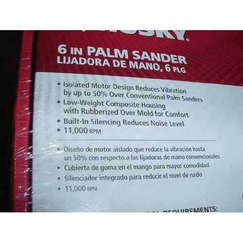 The new Husky air tool line is built to industrial standards for the professional user providing more power, less noise and longer life. This new Palm Sander features low weight housing with rubberized overmold for comfort. The isolated oil free motor design reduces vibration by up to 50% over conventional palm sanders, and allows use of the tool without lubrication. The internal silencing greatly reduces tool noise and the built-in regulator allows you to match the speed of the tool to the job. Designed for surface preparation and final finish sanding of metals, plastics, composites, fillers and glass fiber used on autos and recreational vehicles. The orbital action provides the smoothest swirl free finish possible; this design tool is favored for auto repair shops and high volume furniture/wood product manufacturers where the finest surface finishes are required. 11000 RPM Isolated motor design reduces vibration up to 50% over conventional palm sanders Rubberized overmold for comfort Built-in silencing reduces noise level Built-in air regulator allows to adjust the tool speed to the job Low weight design; only 1.81 lbs.