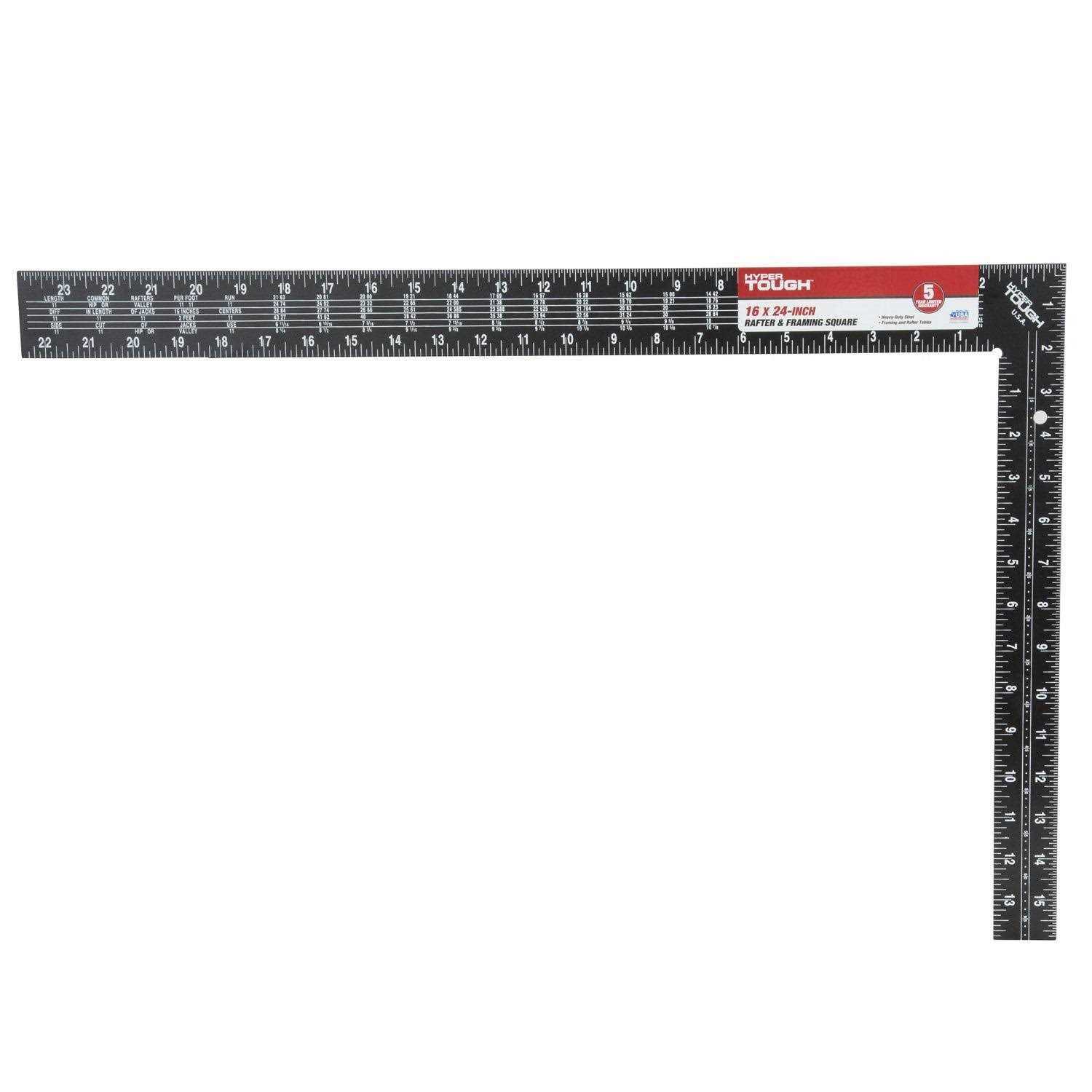 Complete roofing projects and other jobs with the help of the Hyper Tough 16 inch x 24 inch Black Steel Rafter Square. A high-visibility powder finish makes the thermo-bonded embossed graduations in four scales easier to read for precise measurements. There are also rafter, brace and framing tables to make accurate calculations for every project. A hang hole offers convenient, space-saving storage in your workshop, while high-grade steel construction provides longer life and durability. Markings in English and Metric increase the versatility of this framing square tool. It’s a useful measurement device for professional contractors and do-it-yourselfers alike.
