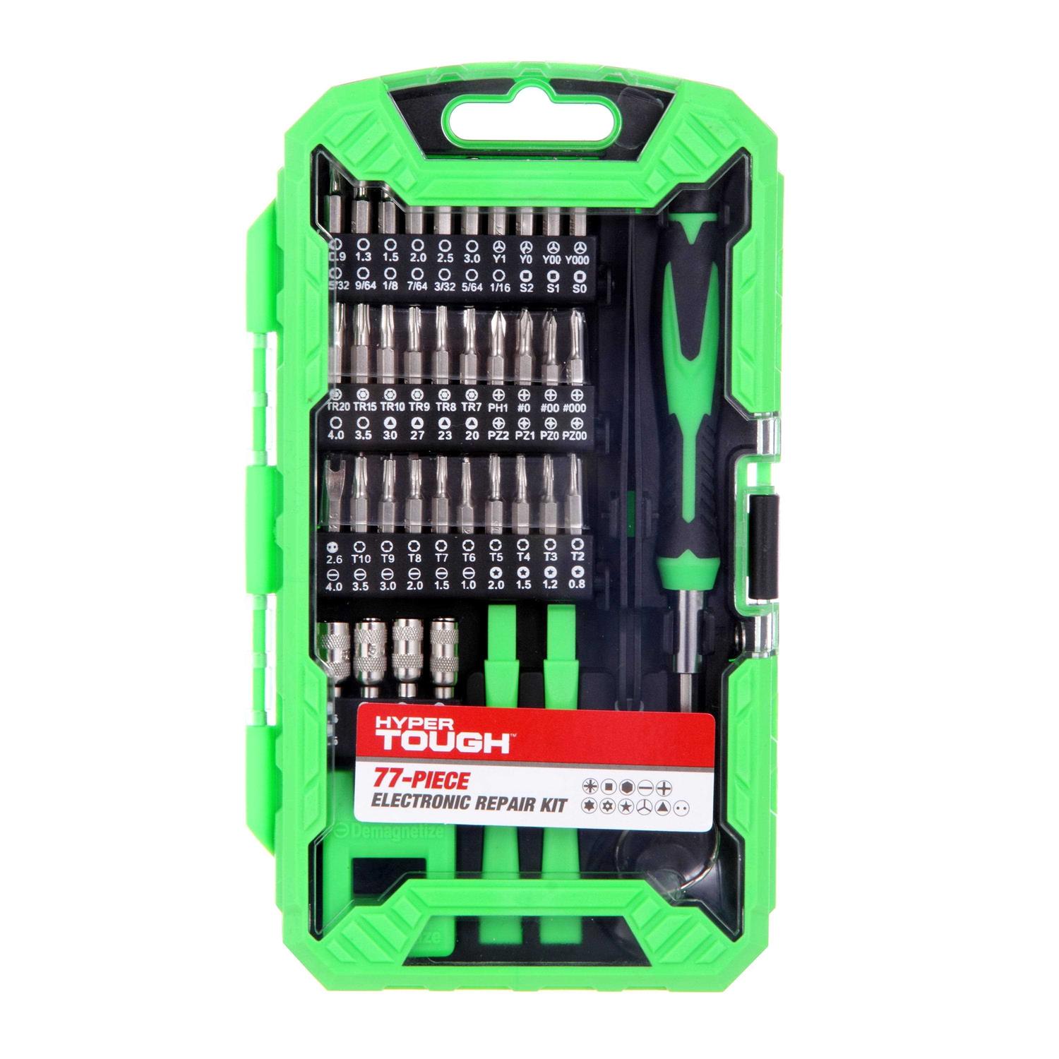 The Hyper Tough TS85128A, 77 Piece Computer Repair and Maintenance Tool Kit includes all the essential tools to repair mobile devices, laptops, computers, wristwatches, eyeglasses and other electronics. Tools are chrome plated to resist rust and corrosion and they come in a handy storage case. The t
