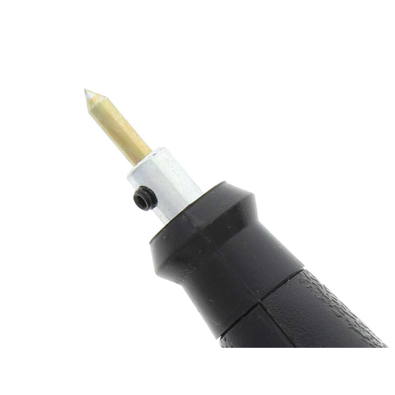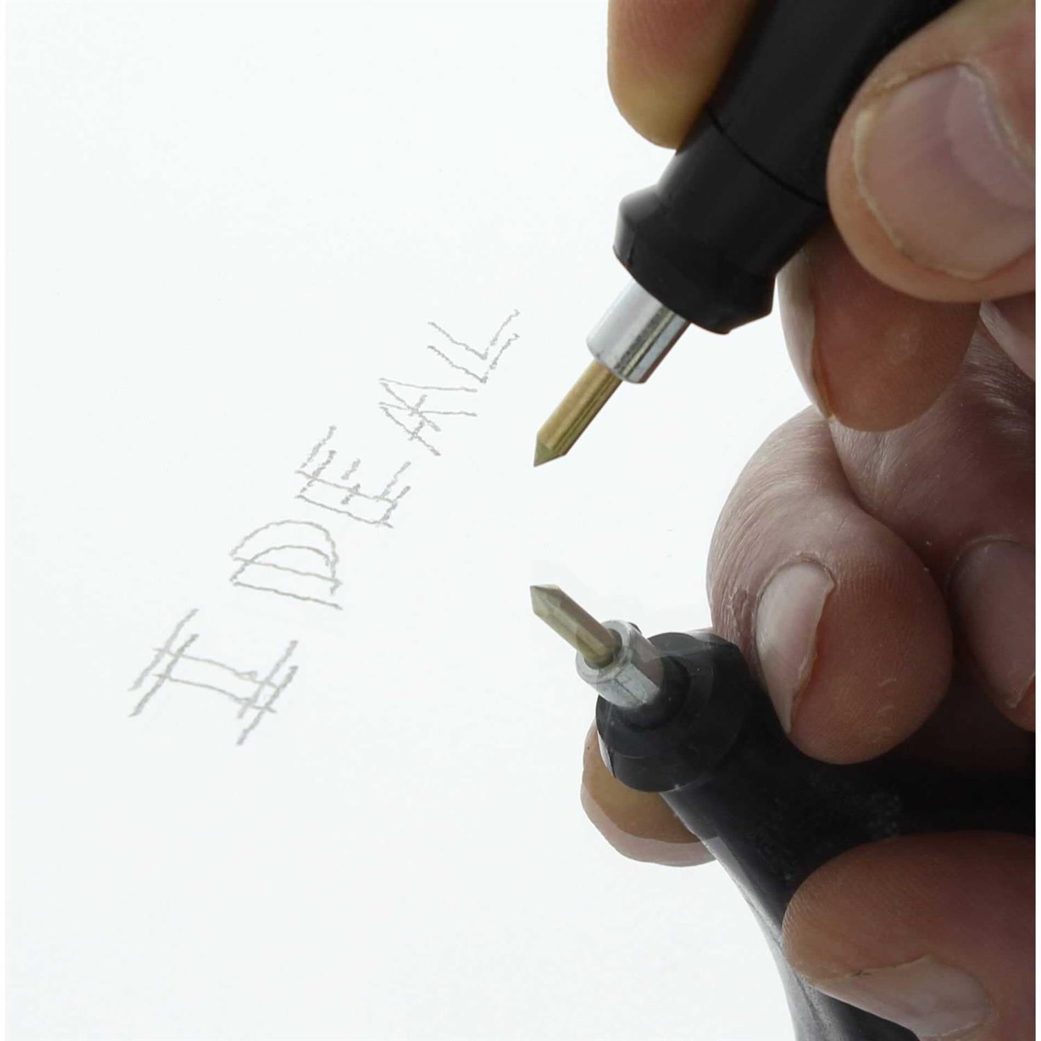 It comes supplied with a carbide point tip and a diamond point is available for engraving extra-hard materials. A stroke-adjustment dial regulates the engraving depth from fine lines to deep grooves. It operates at 7,200 strokes per minute and features a unique design that reduces bouncing to provide smooth, easy writing.