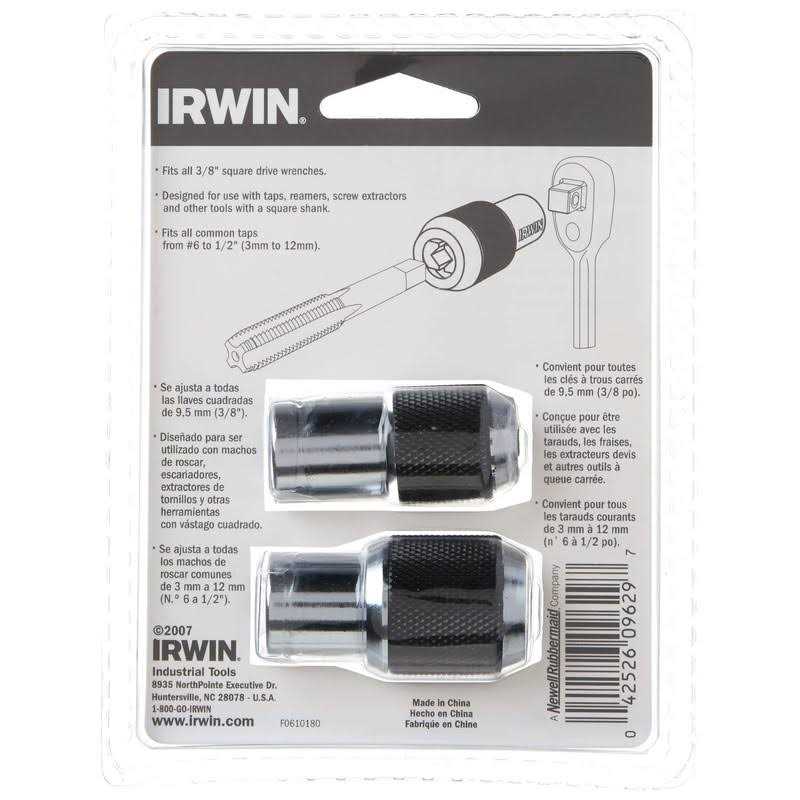 These IRWIN HANSON Tap Adapters feature a 3/8-inch square drive to accommodate a socket wrench or extension. Their versatile design makes them suitable for use with taps, reamers, screw extractors and other tools with a square shank.
