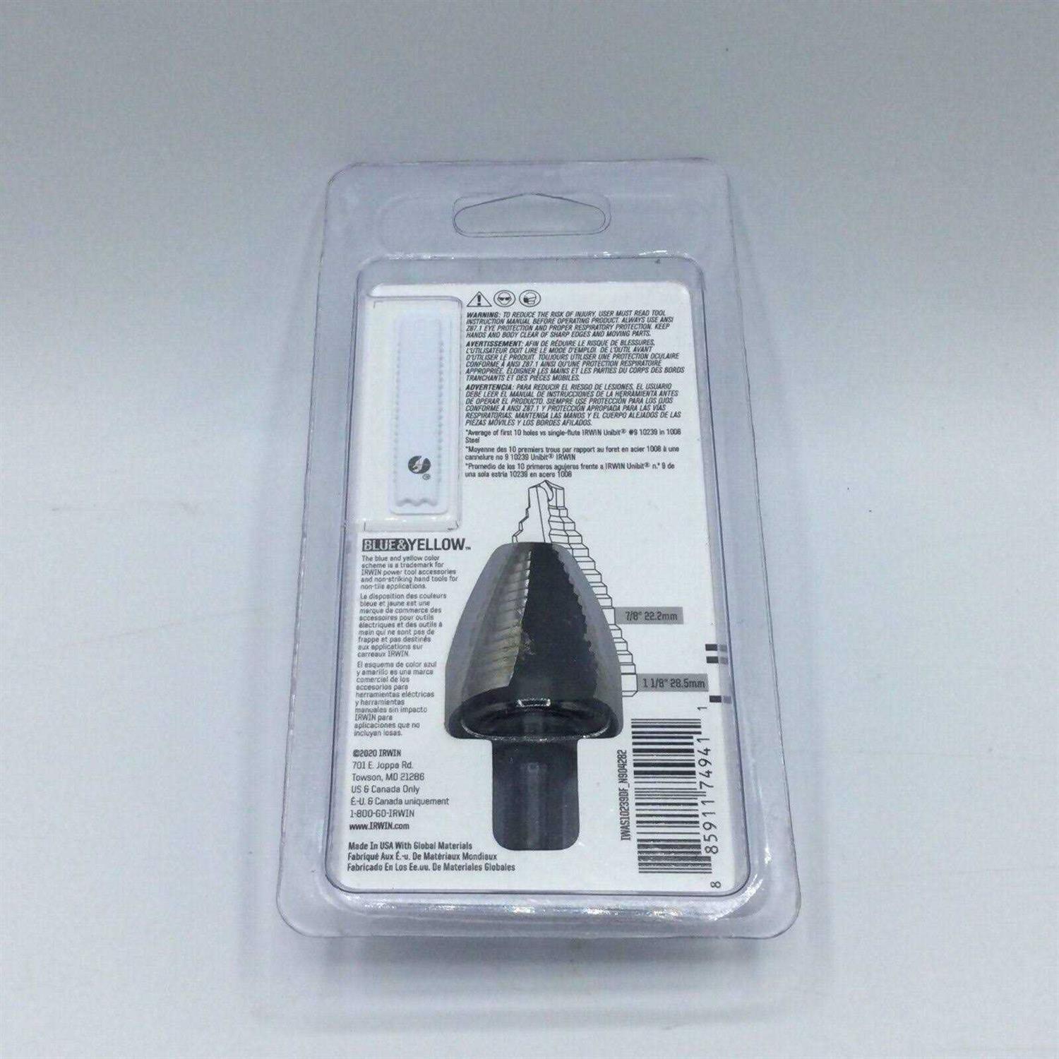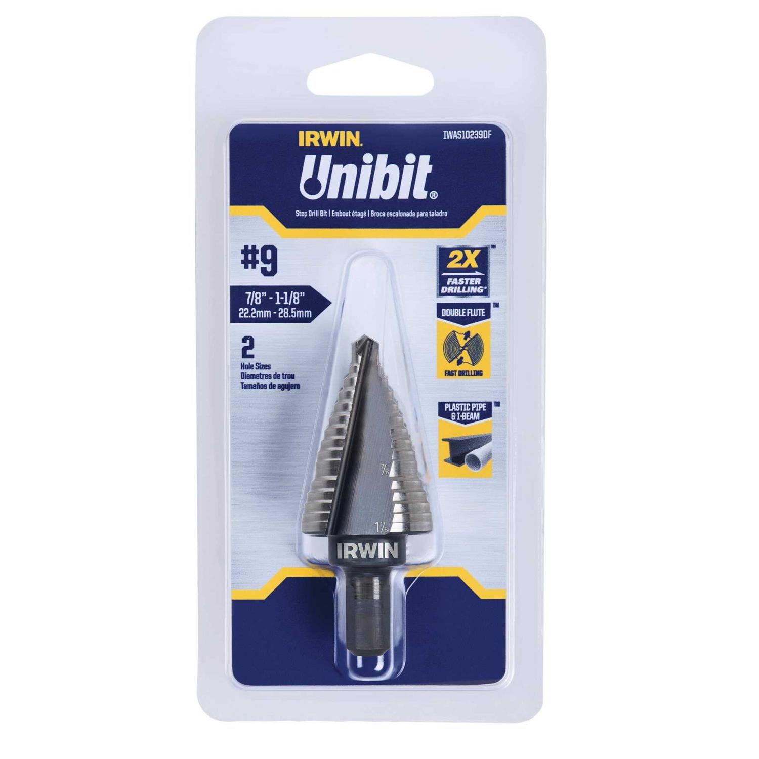 IRWIN Double-Flute Unibit #9 Step Drill Bits are ideal for drilling holes into thin materials such as stainless steel or sheet metal and offer 2 times faster drilling versus a single-flute design. The dual-flute cutting edges helps to deliver clean holes and 2 defined and marked steps allows for quick drilling of 7/8-in and 1-1/8-in in diameter (22mm to 29mm).