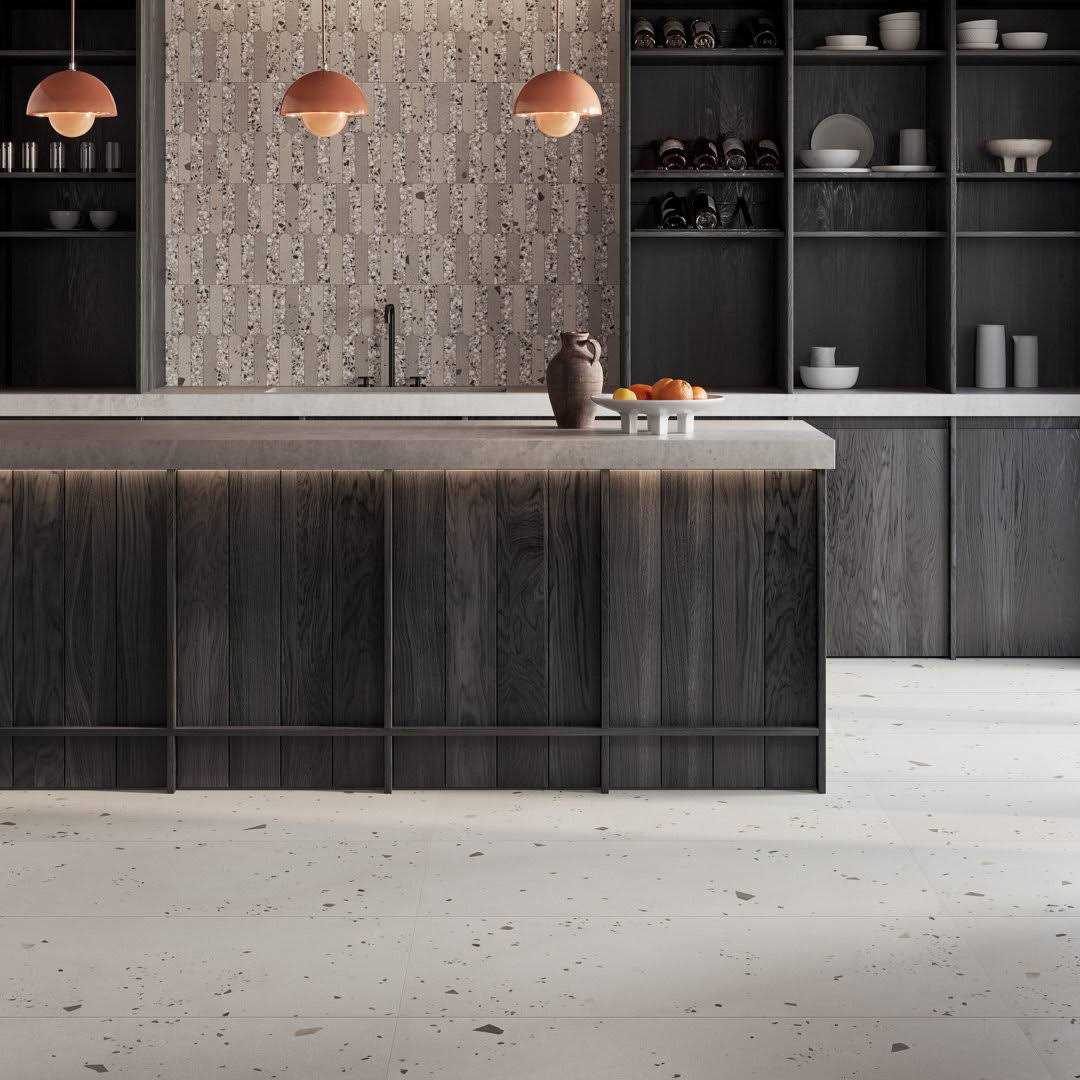 Timeless terrazzo goes contemporary in this collection of large-format porcelain tiles. Designed and made in Italy, honors the rich history of terrazzo—the blending of marble chips and clay invented in the 16th century—while reimagining a classic with modern 3-D printing. The result is a color-body porcelain tile with subtle texture and a handcrafted, artisanal look.