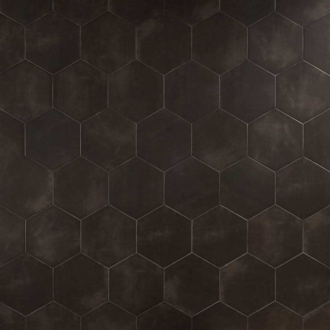 The HexArt Nero 8″ Hexagon Porcelain Matte Tile adds dramatic color to its classic hexagon shape with a wash of soft, inky black with natural shade variation. This Spanish-made, 8-inch matte tile is a lovely addition to any room, particularly the kitchen or bath. Install on its own, or pair it with another style from the collection for a more dramatic look. The HexArt collection of encaustic-look, matte porcelain tiles, reinvigorates the classic hexagon shape, one of the most enduring formats, in a range of cheerful hues and classic neutrals. These Spanish-made, 8-inch hexagons are available in eight colorways. Choose from solid color, a midcentury-inspired fan pattern, or a color block asymmetrical design—all with natural shade variations. HexArt invites creative mixing and matching for a customized look. The collection is well-suited for use on floors and walls, indoors and outdoors, as well as showers and baths. To make encaustic tile, a carved stamp is pressed into wet clay; pigment is added, giving it the appearance of a handmade inlaid pattern. By printing patterns on porcelain, the same vibrancy can be achieved—and you get the benefits of a durable material (porcelain resists scratches, water, and fading) that’s easy to maintain.