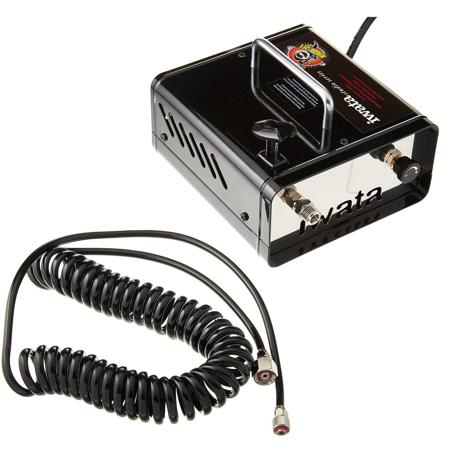 The Iwata Ninja Jet compressor proves ideal for the hobbyist or professional user who needs a small reliable source of air. The Ninja Jet’s quiet operation makes it ideal for use in small work spaces and it is capable of powering most gravity feed airbrushes for low pressure applications of 1 to 15 psi. This compressor is simple to operate and requires zero maintenance providing easy reliable air when you need it. The air regulator knob allows you to adjust the working pressure so you can find the best spray for your airbrush and project. The built-in airbrush holder provides a safe and convenient place to rest your airbrush when you are not spraying. Includes a durable polyurethane cobra coil airbrush hose for Iwata airbrushes. Also included are air hose adaptors for Badger Aztek and Paasche brand airbrushes and a detailed operation manual.