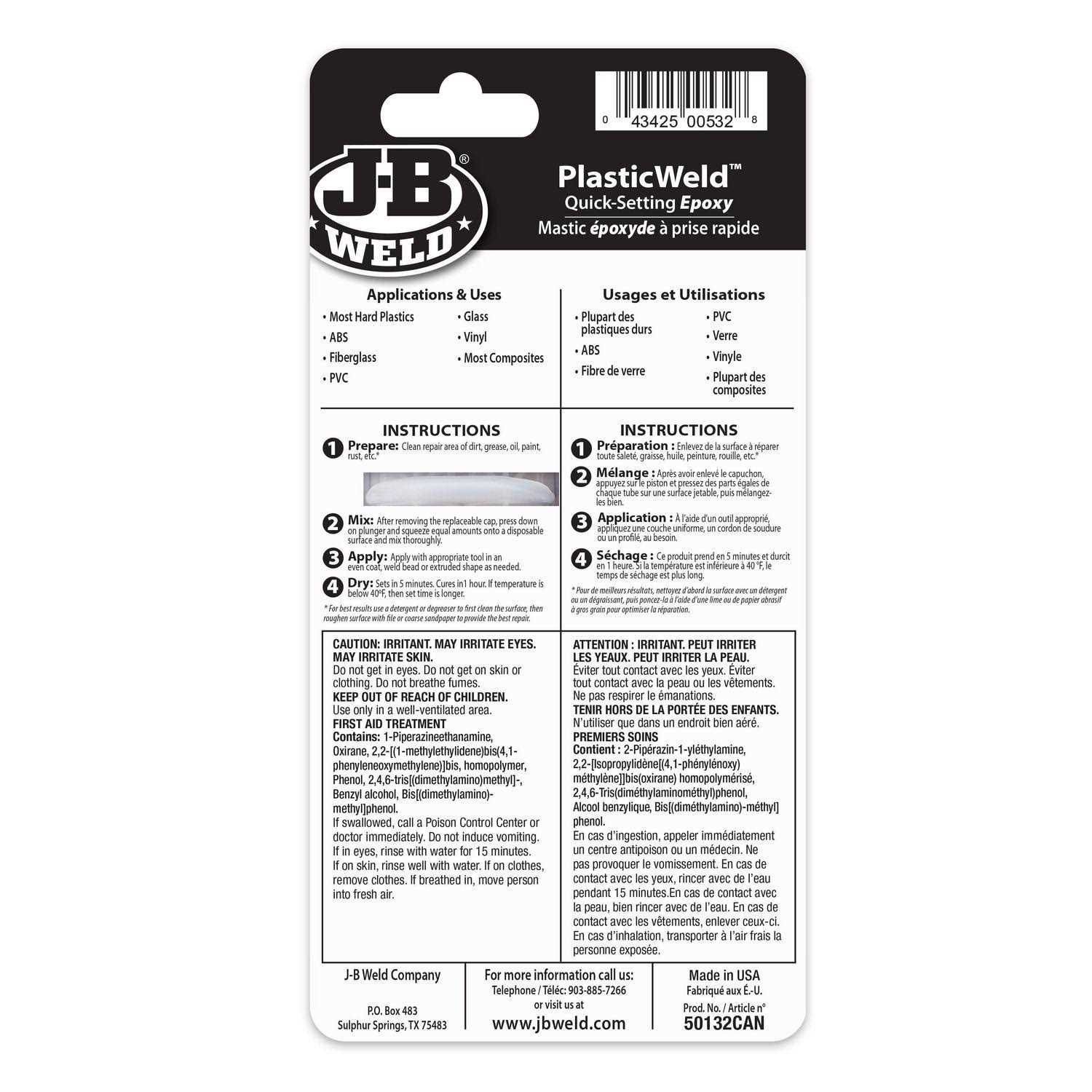 J-B Weld 50132 Plasticweld Syringe Epoxy is a specially formulated two-part adhesive and epoxy filler system that provides for strong, lasting repairs. PlasticWeld will bond a variety of surfaces, such as metal, composites, fiberglass and others. PlasticWeld sets in 5 minutes at room temperature and is fully cured in 1 hour. Using a 1:1 mixing ratio, PlasticWeld combines to a tensile strength of 3900 PSI and cures clear.