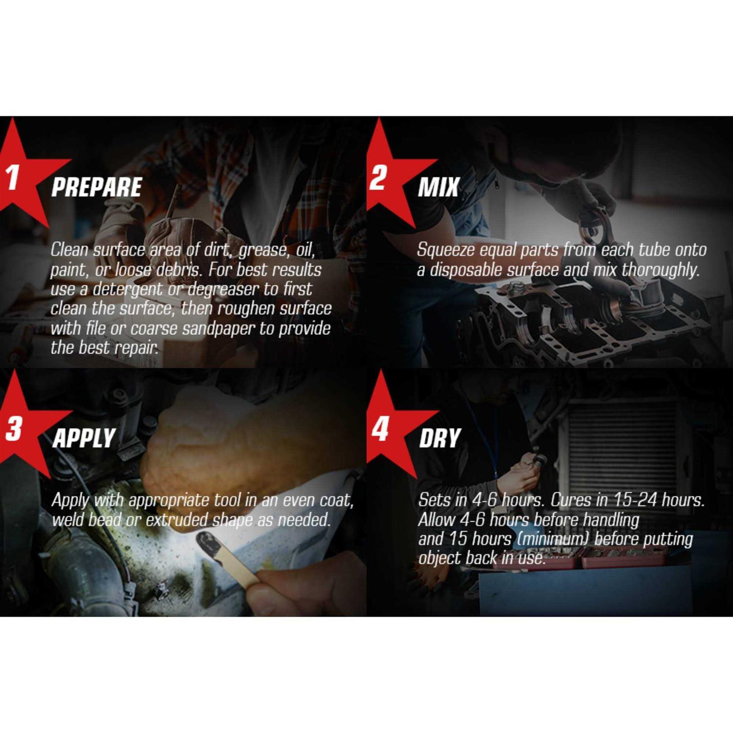 J-B MarineWeld is a specially formulated two-part epoxy cold weld system that provides for strong, lasting repairs for bonding different or similar surfaces, such as aluminum, metal, composites, fiberglass and others. MarineWeld sets in 4-6 hours at room temperature and is fully cured to a dark grey color in 15-24 hours. Once cured, it can be shaped, tapped, filed, sanded and drilled and will retain its strength above or below the waters’ surface. MarineWeld has a 1:1 mixing ratio and tensile strength of 5020 PSI.