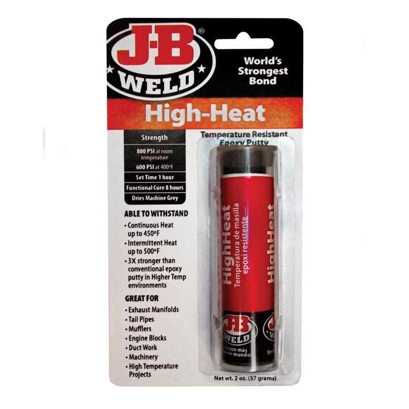 J-B Weld HighHeat is a hand mixable epoxy putty stick specifically formulated to bond and repair materials that will be exposed to high temperatures in automotive and industrial maintenance applications. It cures to a tough, hard bond with little to no shrinkage. This industrial-strength product outperforms conventional epoxy putties at high temperatures and sets in 1 hour at room temperature. After 8 hours, it can be drilled, tapped, machined, ground, filed and painted. HighHeat is rated at a tensile strength of 800 PSI and cures to a machine grey in color.