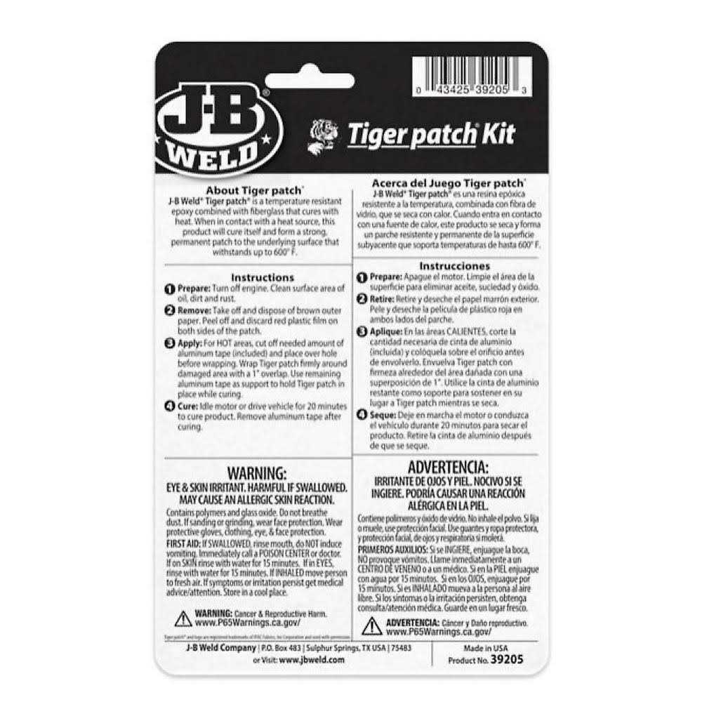 The J-B Weld Tiger Patch Epoxy Kit is a temperature resistant epoxy combined with fiberglass that cures with heat. When in contact with a heat source, the epoxy will cure itself and form a strong, permanent patch to the underlying surface. This powerful epoxy can even withstand muffler and tailpipe temperatures, making repairs a breeze. Epoxy-coated fiberglass wrap. Patch kit withstands up to 600 degrees F. Hardens like steel with heat in 20 minutes. Patch kit comes with aluminum tape for long-term patch repair on mufflers and tailpipes. Handy repair kit is great for automotive uses. Made in USA.