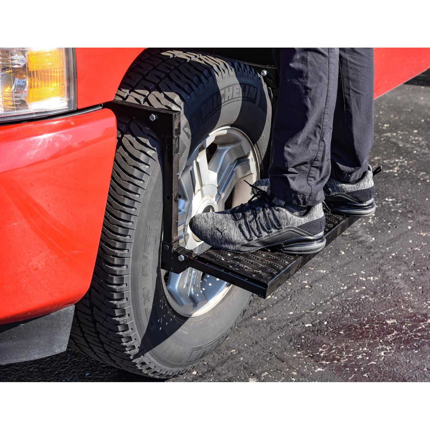 Tire Steps by JEGS. Details:Truck Wheel Step – Capacity: 300 lb. – Platform: 21.75 in. L x 7.25 in. WAdjustable – Widths: 8 in. 9 in. & 10 in. – Heights: 7 in. 10.50 in. & 14 in. – Weight: 11.60 lbs. – Folded Size: 21.75 in. L x 16 in. W x 4 in. HPowder Coated Finish JEGS 81158 Truck Wheel Step allows you to access under the hood or in the bed of your truck with ease. Just set the wheel step over your tire, and you’re ready to go. Its easily adjusted to fit almost any Car, Jeep, Truck, or SUV and fits tires from 8 inches to 10 inches wide. This step is perfect for lifted vehicles and excellent for allowing you to access those hard-to-reach areas while washing and waxing. It also allows for easy access to a rooftop cargo carrier. The fold-up design makes for easy storage and takes up minimal space in your cargo area. – Features:Non-slip tread pattern for extra security21.75 in. x 7.25 in. platform300 lb. capacity – Adjustable from 8 in. to 10 in. wide & 7 in. to 14 in.