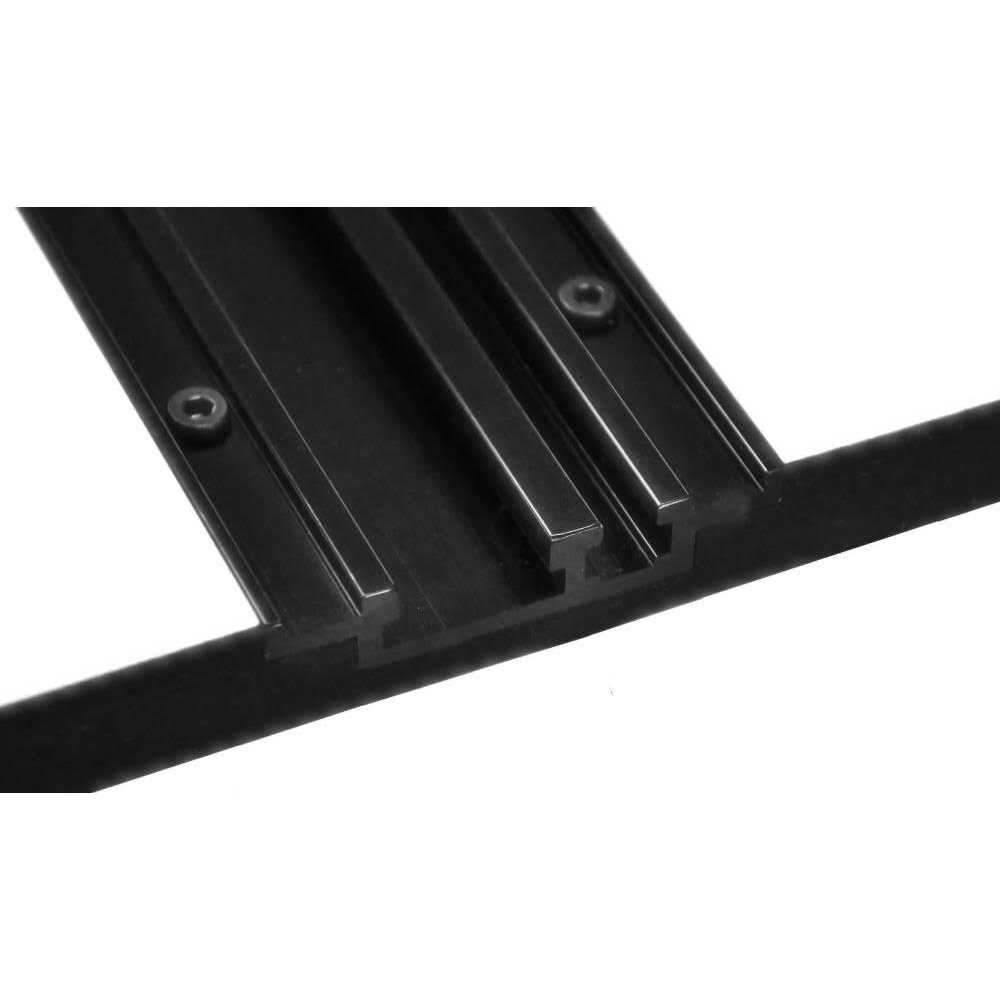 The ultimate table top material for todays hi-tech woodworking machinery is our laminated phenolic. Phenolic is one of the strongest, most stable and durable materials available for an industrial strength work surface. Our table top is 3/4in thick and will not warp, sag, swell or corrode. Phenolic is the step up material for todays woodworking pros and virtually renders melamine an obsolete option for long term professional use. The mast-r-top is available pre-machined for our rout-r-lift ii, mast-r-lift ii or our rout-r-plate. The underside is also pre-drilled for our mast-r-fence ii, rout-r-fence and rout-r-table stand. All mast-r-top’s have an extruded aluminum track with a t-slot for standard 1/4in hex head bolts or hex nuts and standard 3/4in miter slot. New extruded aluminum track with 1/4in t-slot for your accessories and standard 3/4in miter track.