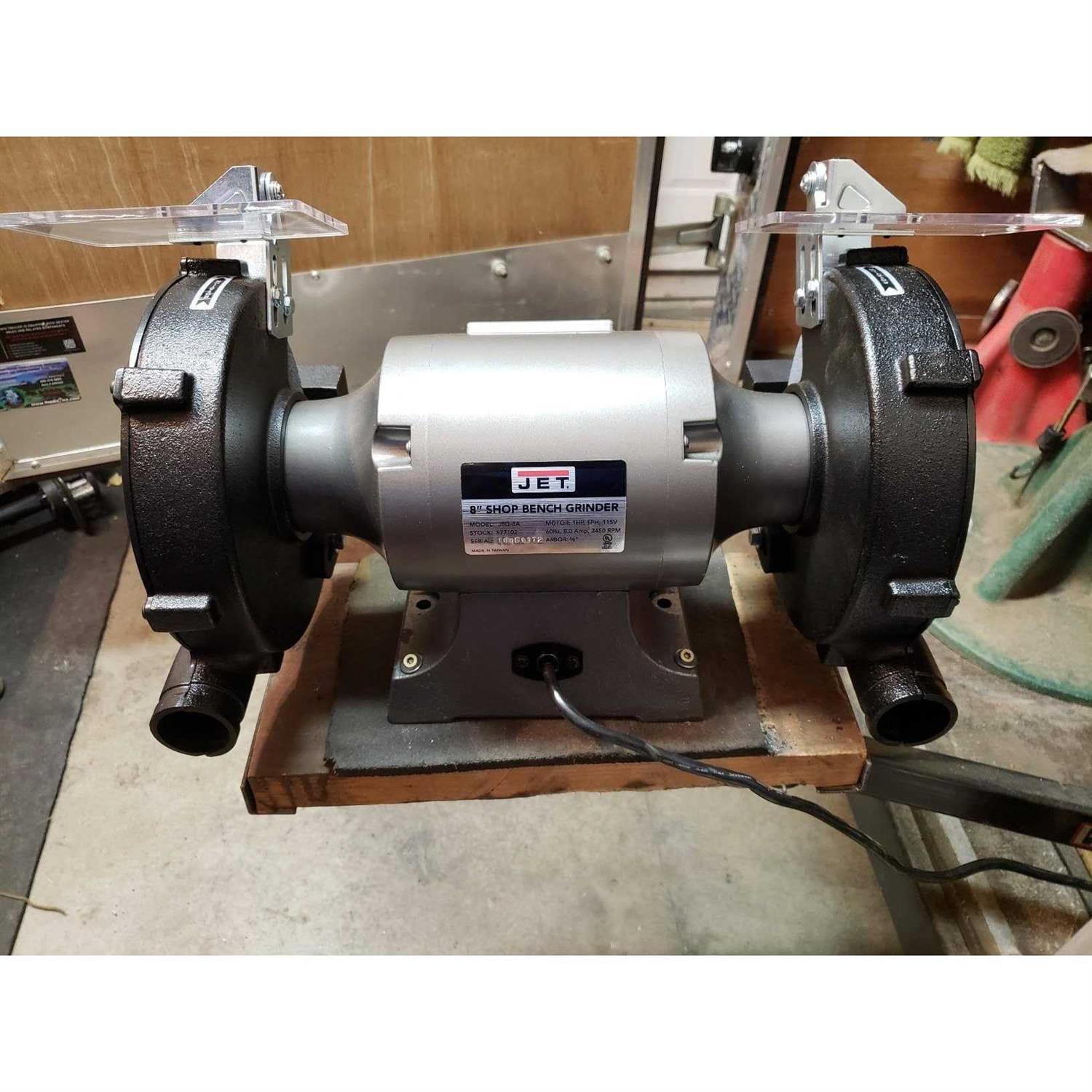 Sharpens, shapes, deburrs and removes material fast Totally enclosed, pre-lubricated ball bearings Heavy-duty guarded toggle switch on 8″ One-piece quick adjusting spark guards Cast iron wheel guards and dust vents The Jet 8-Inch Bench Grinder comes with industrial grade 36-grit and 60-grit 8-inch wheels for maximum working versatility. The 1-horsepower, 115-volt motor operates at 3450 RPM and will deliver plenty of power for heavy grinding. The grinder sits on a rubber foot to prevent unwanted movement and can be bolted down if desired for maximum stability. UL listed.