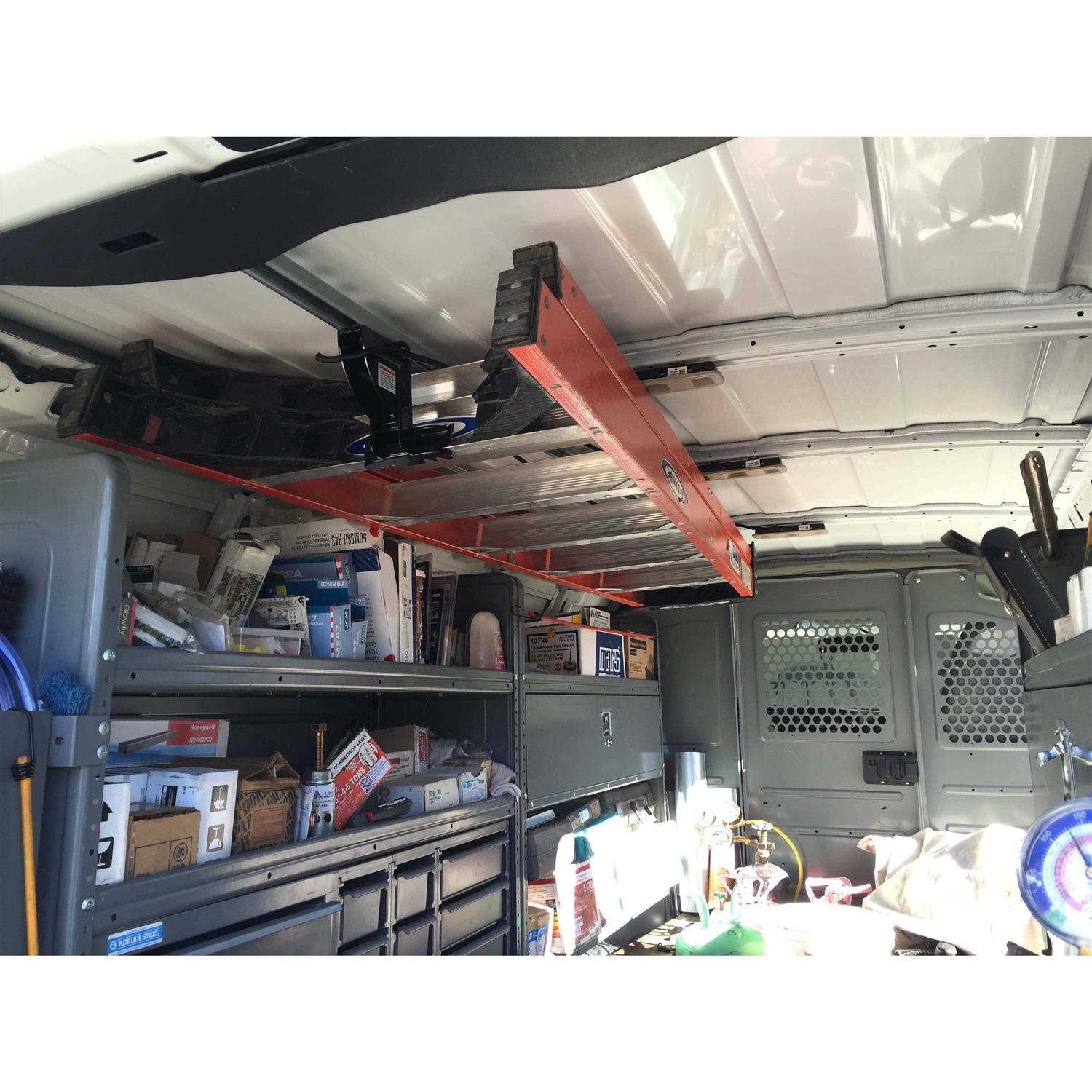 The JET Rack ladder storage system was designed by contractors for contractors, providing quick storage and easy access to your most frequently used ladder by utilizing the most underused space in your vehicle, the ceiling! Take advantage of this unused interior space of your cargo van and eliminate the back breaking hassle of loading ladders on the roof. JET Rack is the number one selling interior storage ladder rack on the market. Innovative and easy-to-use, its tension-based mechanism accommodates most A-frame ladders up to 10′ long, with a custom fit that won’t let ladders shake loose during transport and storage. Use the tool hole at the top of your ladder to slide open the rack and slip the base of the ladder into the catch bracket to easily, safely, and securely store your ladder. In van storage ensures that your ladders will remain protected from the weather, theft, and shifting cargo while remaining easily accessible when you need them the most. Purchase your JET Rack system with an optional Universal Mount System kit for use with truck caps or vans with protruding roof support beams. The JET Rack also easily mounts to a 13/16 inch Unistrut channel which is readily available at most major home improvement stores. Unistrut channel not included with the JET Rack system.