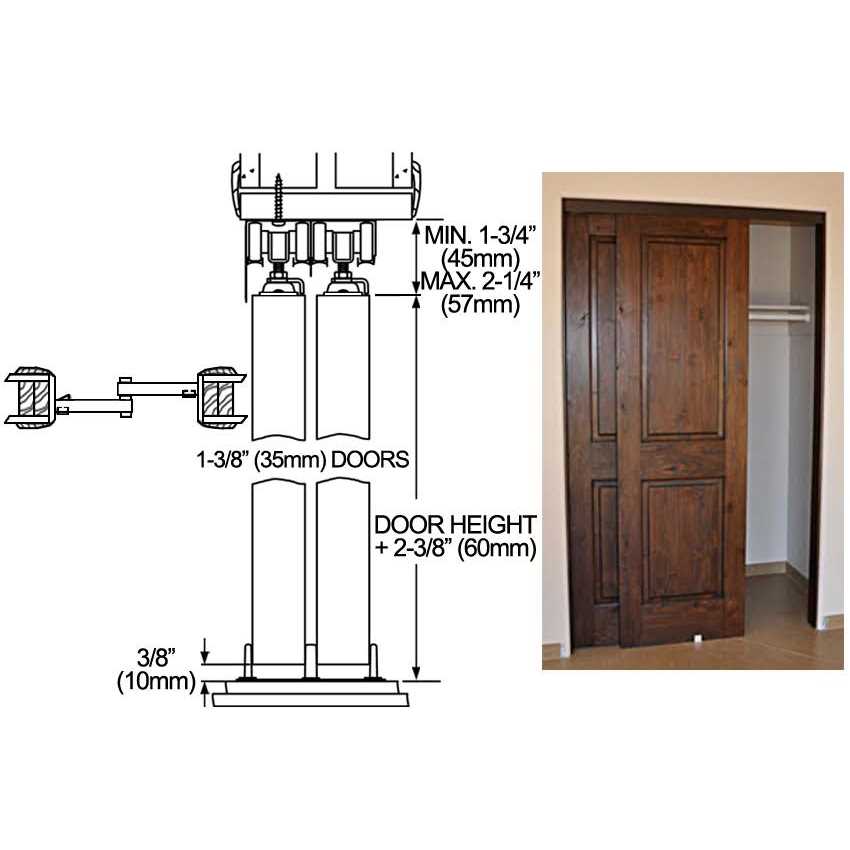 Precision extruded commercial grade aluminum track features Johnson’s line-design fascia to hide finger marks and scratches or to hold paint if desired. Patented “tricycle” hangers with 1″ [25mm] dia. wheels ride smoothly and quietly on convex shaped rails with single point contact. Hangers feature a quick disconnect clip system facilitating easy mounting or dismounting of door panels. Hangers are adjustable for height in case of settling. Sliding Bypass Door Hardware Sets for standard door/opening widths. – Sets include all necessary hardware for 4 door sliding bypass installations. – The 138F is compatible with 1-3/8″ [35mm] thick doors only. – Track can be cut down to accommodate narrower doors/openings. – Custom 138F configurations possible by ordering 138F components by the piece.