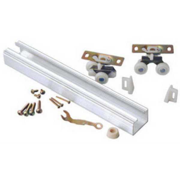 Commercial grade heavy wall aluminum single door track set, for single doors from 1″. Up to 1-3/4 in. Up to 125 lb, 72″ long track. Jump proof. Includes patented adjustable tricycle hanger, will not bind, quick release clip for easy mounting/ dismounting, bumper, door guides & screws.