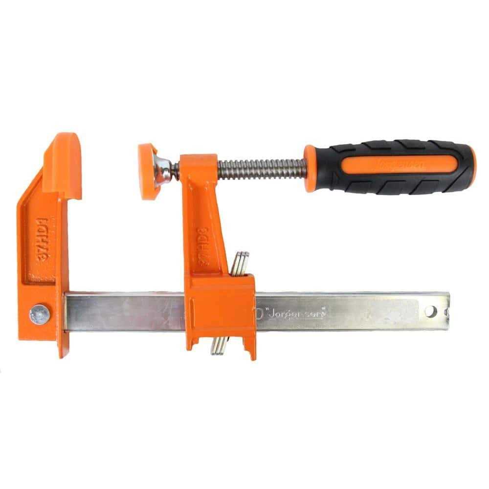 Jorgensen steel bar clamps are seriously strong. Cast-iron stationary and sliding heads with orange-powder coated finish are merged with a high-carbon rust-resistant steel bar that packs a whopping 85,000 pounds per square inch of tensile strength. The fast-acting sliding head is acme threaded to accommodate a cold-drawn steel screw with a large easy-grip handle and swivel pad. And our original multiple-disc-clutch design allows the sliding head to hold securely at any point along the bar.