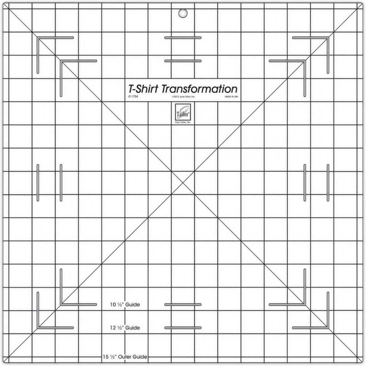 Give life to your old shirts with this 15.5″ x 15.5″ June Tailor T-Shirt Transformation Ruler. Included you will find three guides sizes to accommodate a wide variety of t-shirt sizes and graphics. Center, mark and cut stunning and symmetrical t-shirt blocks for quilts, pillows and tote bags with this t shirt quilt ruler.