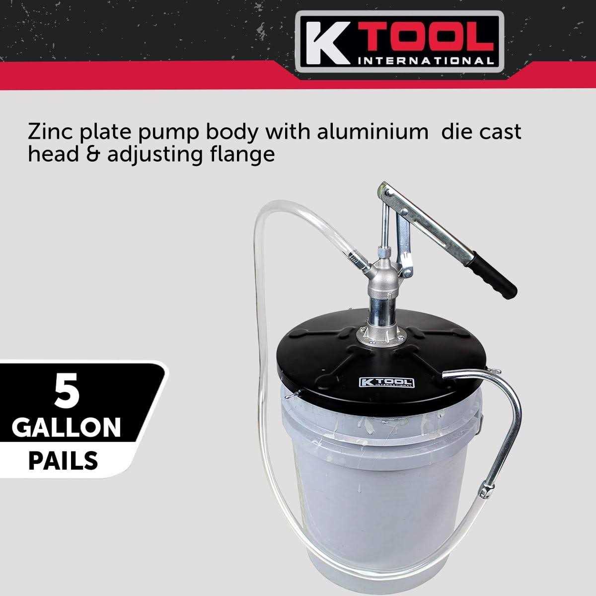 The K Tool International Lever Action bucket Pump is perfect for all the transmission and heavy oil transfer needs! Each stroke can move 2.14 OZ or 60 ML and comes with a 12 inch drum cover and 4 foot long oil resistant flex hose with curved nozzle. This K Tool International lever action bucket pump fits 5 gallon pails which gives you a sense for the scope and size of this item. This lever bucket pump is PERFECT for commercial use and hard to reach areas to move fluid and large vehicles. Net weight of the entire unit is 6.08 lbs. Lightweight and durable all at the same time! Product development at K Tool International goes way beyond the actual product itself, striving to enhance our understanding of the end-users needs. Since 1984, K Tool International leads the market by ensuring that its products are rugged, reliable and reasonably priced for all users.