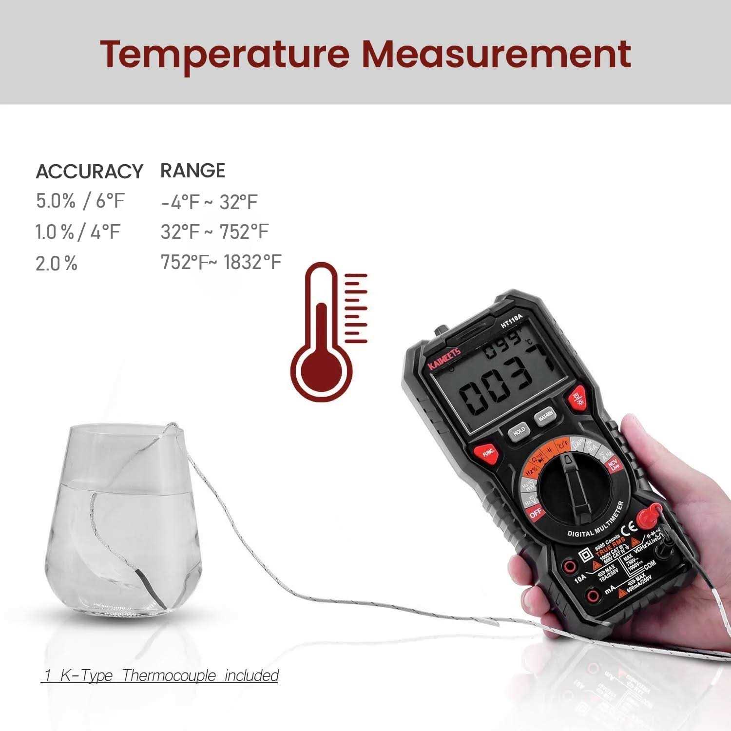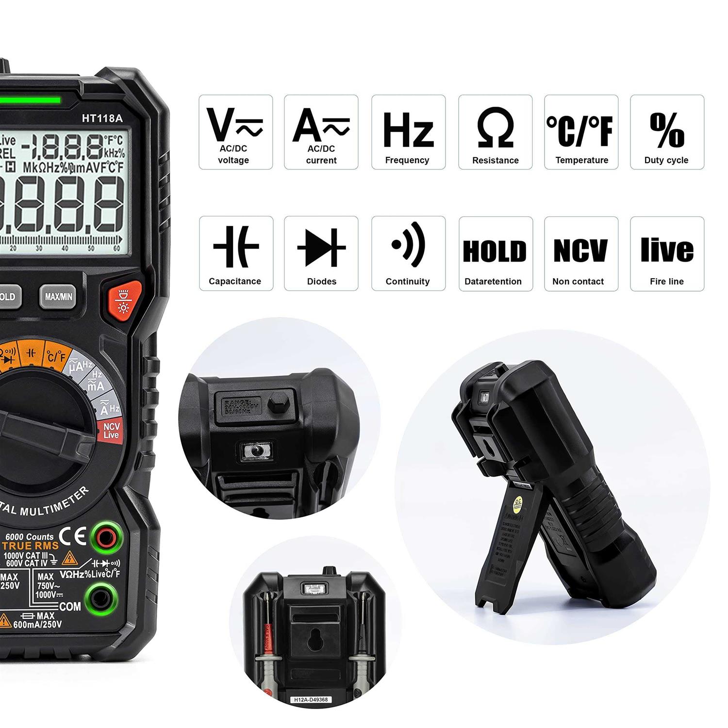 KAIWEETS HT118A Digital Multimeter Professional, T-RMS Autoranging Multitester 6nn– u27A4u3010WIDE APPLICATIONSu3011–KAIWEETS digital multimeter features 6000 counts auto-ranging for accurate measurement of AC/DC voltage, AC/DC currentDC is the default, resistance, continuity, frequency, capacitance and diode, liquid temperature, wire on-off, Battery checking. This advanced tester can diagnose automotive, industrial and household electrical issue.n– u27A4u3010EASY OPERATIONu3011–Switch the dial and the LED lights on the jacks will shine accordingly. To plug in the leads is a real ease. Large 2.9u201D LCD backlight display. Dual Display with bar graph. Flashlight on the back ensures easy use in dimly lit places. Stable Kickstand, pen slot on the back.n– u27A4u3010MULTI-FUNCTIONu3011–Non-contact voltage testing and Live function with sound and light alarm. The Sceen changes to red while detecting live wire. Low battery prompt, Data retention, Max/Min data, Auto Po.