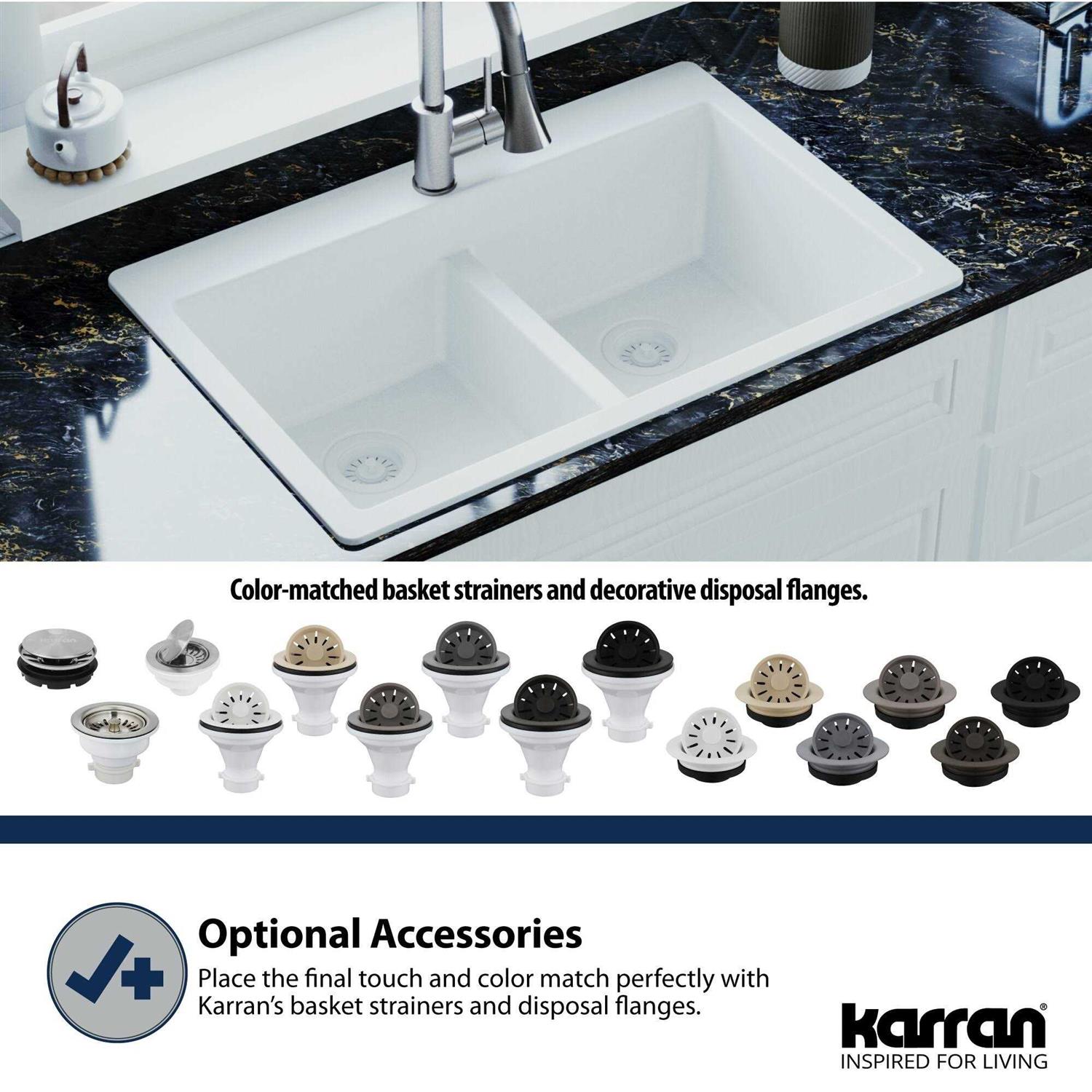Our Karran color-matched kitchen sink decorative disposal flange is the perfect complement to your Karran quartz sink. It is manufactured from durable ABS plastic that is the same color and material throughout, so it won’t peel or flake. Finish off your beautiful quartz sink with this attractive decorative disposal flange.