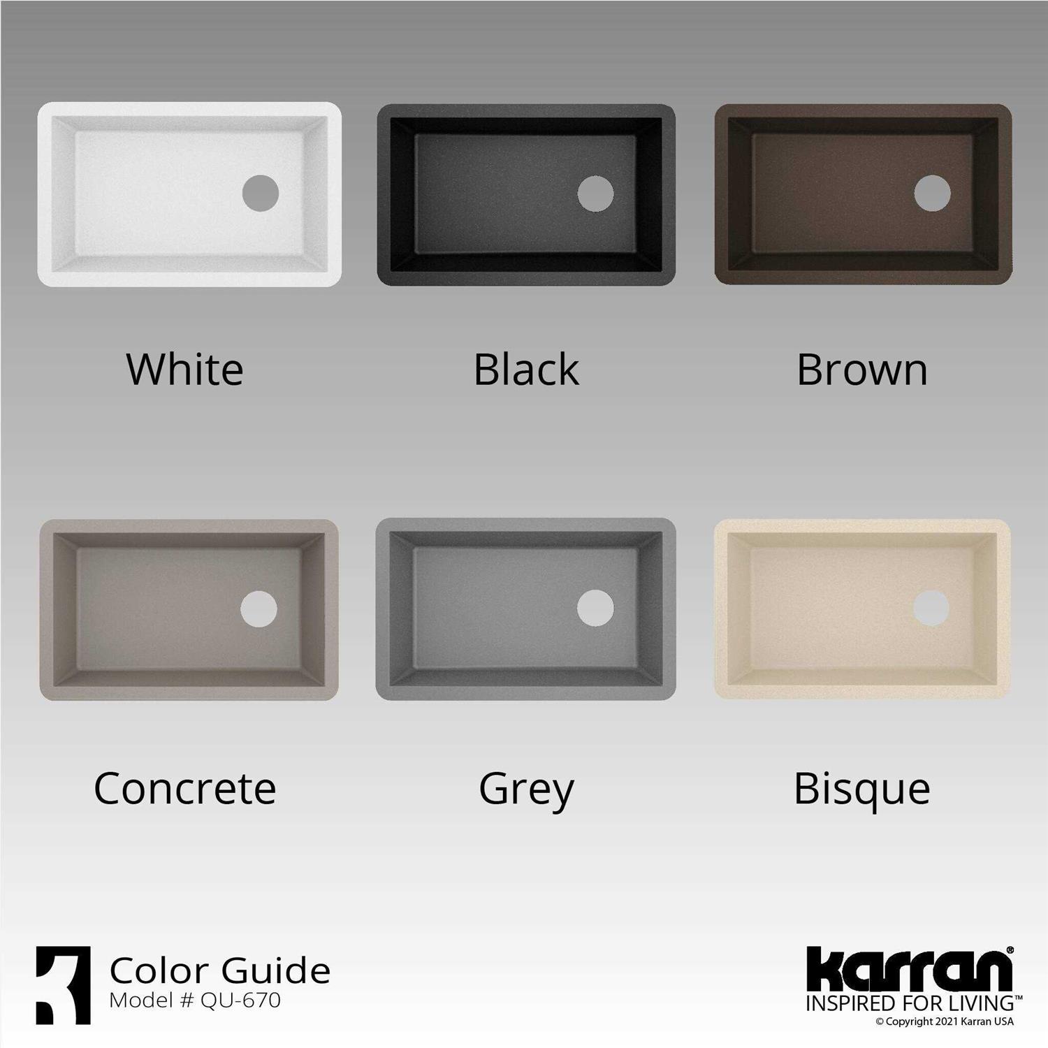 Add style and color to your kitchen. Karran’s QT-670 quartz sink is the perfect combination of style and durability. Its surface is ultra-hard and its practical yet elegant design is perfect in any of today’s kitchens. This sink is produced from 80% quartz crystals and the finest acrylic resins. The sinks surface is scratch and chip resistant, and will withstand hot pots and pans up to 530掳F. The smooth, non-porous material means food and beverages won’t stick to or stain the surface making clean easy with just a cloth and soapy water. Choose from 6 color options. This standard size sink is ideally suited for kitchen remodel projects as well as new kitchen projects. Convenient rear drain placement ensures maximum useable space in sink and cabinet underneath. One faucet hole pre-drilled with additional holes marked on underside.