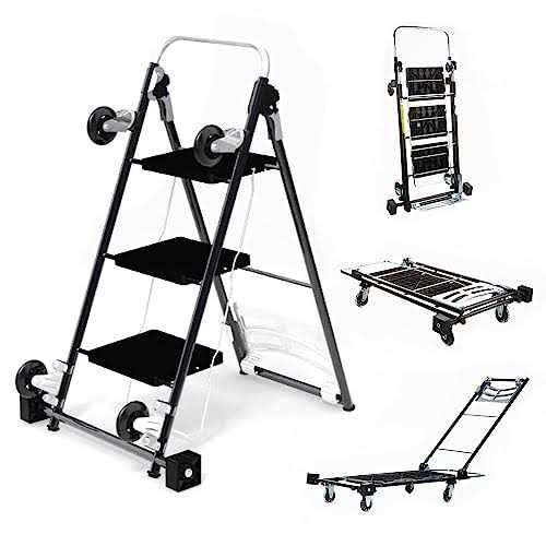 It converts quickly from one position to the other without needing any tools. This utility cart saves space, time, effort and money by replacing up to five items that take up a lot of space in your garage, workroom or barn. The dolly and hand cart can hold up to 400 pounds and move easily on the all steel frame due to the industrial ball bearing-ed in-line skate wheels The hand truck easily handles 150 pounds while featuring a unique resting angle. The three-step ladder in ANSI Safe Certified, resists tipping and can be wheeled from location to location. The Kerry 4-in-1 utility cart is perfect for your home or small business. Steel frame with welded connections is built to last a lifetime Over-sized dolly to handle any load and keep the utility cart balanced Hand cart is the work horse of the 4-in-1 utility cart. Hand truck has a weight capacity of 150 lb.
