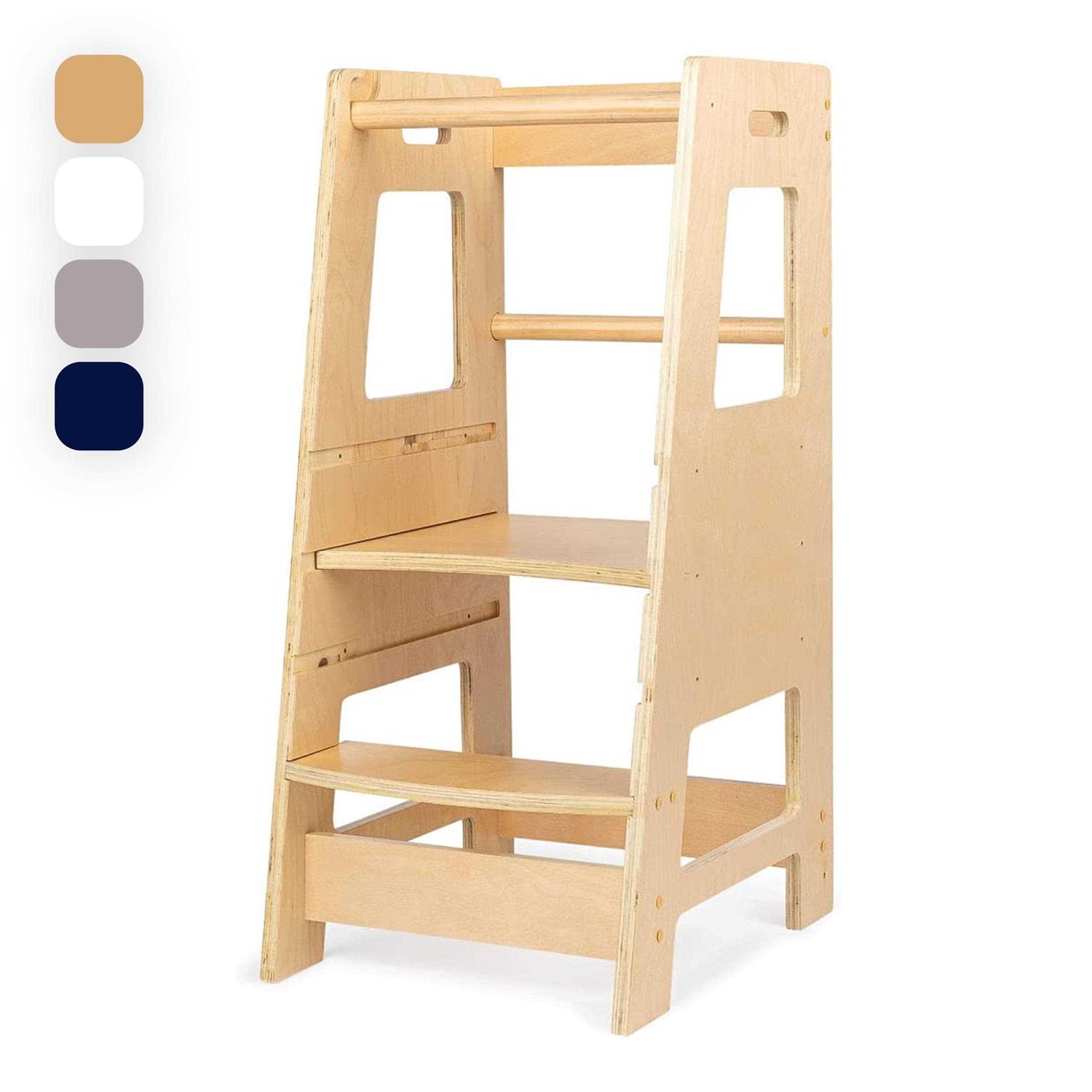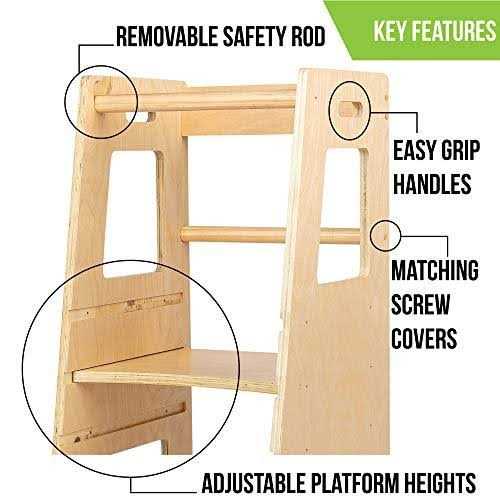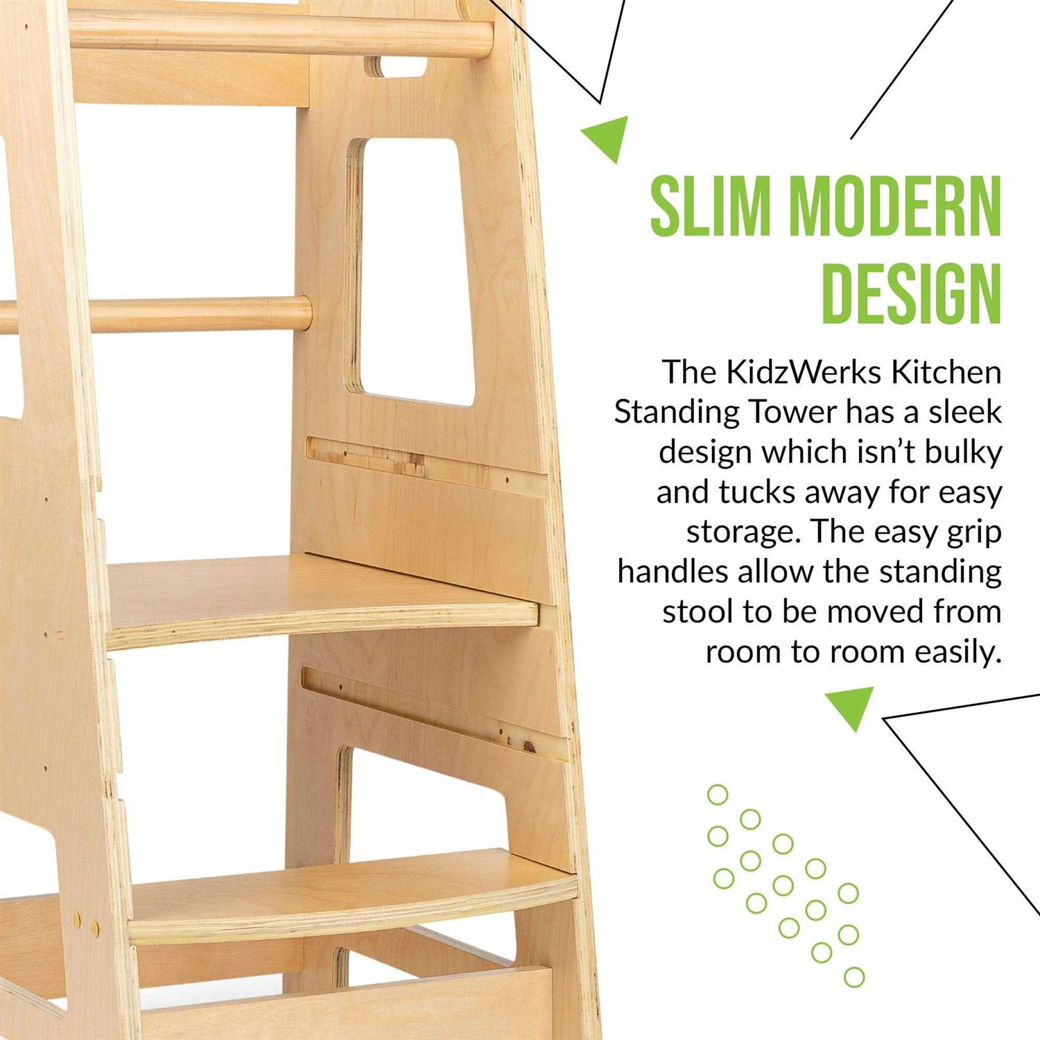 Open-Box — The Child Standing Tower by Kidzwerks! The Kidzwerks Child Standing Tower is the perfect gift for all parents with children 1-3 years old who are looking for some extra help in the kitchen! This KidzWerks wooden kitchen helper step stool has three adjustable levels in order to allow all children the ability to help out in the kitchen! This stylish standing kitchen tower is made of birchwood plywood and is very safe and durable for your toddler! The removable safety rod allows for easy entry and exit for kids who are learning to help in the kitchen! Kidzwerks is dedicated to providing great products for all families and each standing tower step stool was inspected to ensure the highest level of quality and safety. KidzWerks: Helping Little Ones Dream Big!