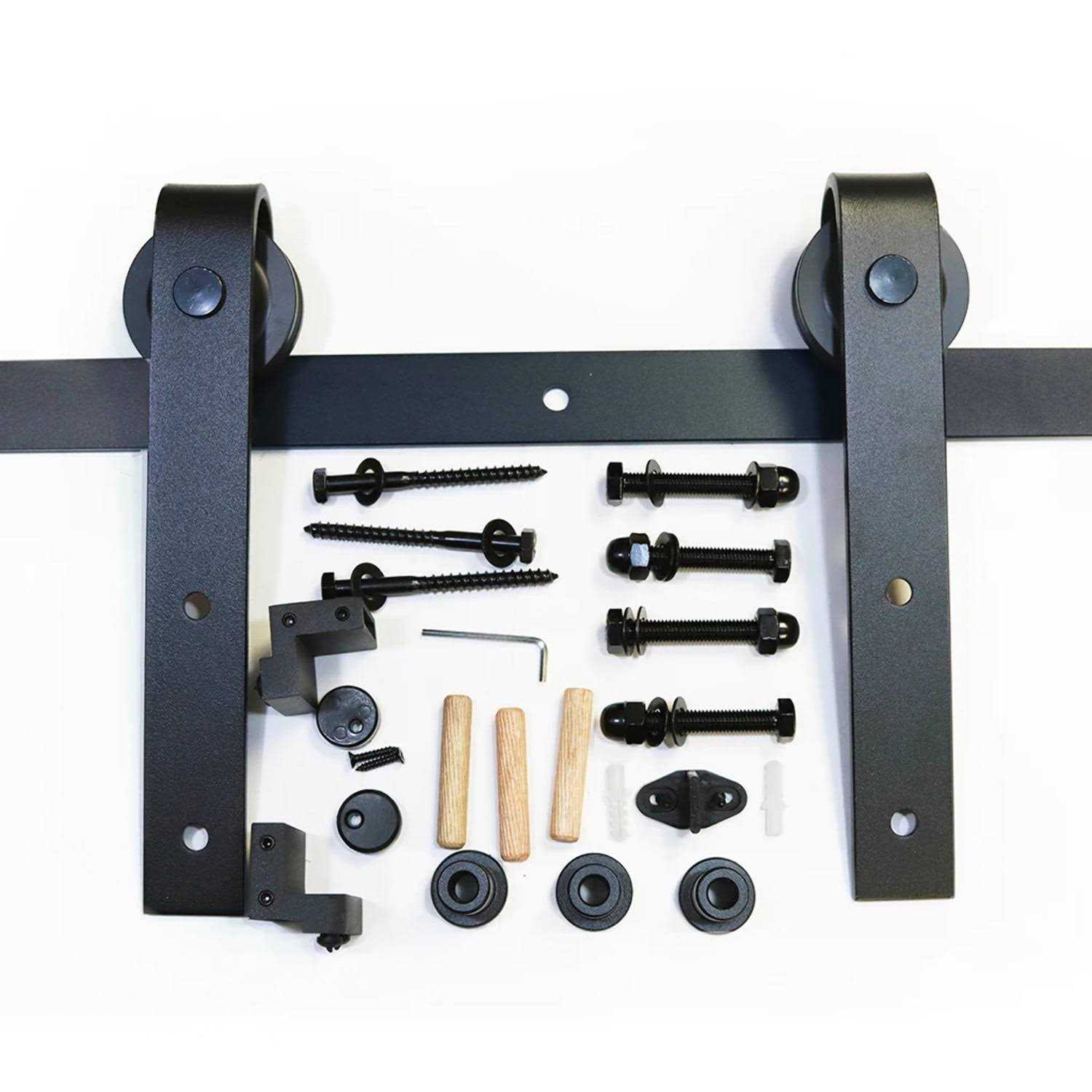 Hang your barn door with our stylish but easy to install heavy-duty barn door hardware. Kit comes with all necessary hardware for hanging the door including sliding track 2-door stoppers 4-wall hangers 2-rollers 1-floor guide 2 anti-jump disks 4 M10 bolts 4 M10 x 60 bolts for 40 mm – 45 mm doors 1-set of accessories instructions. Door weight capacity is up to 200 lbs.