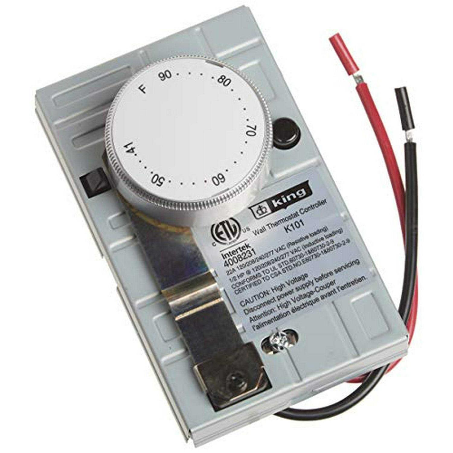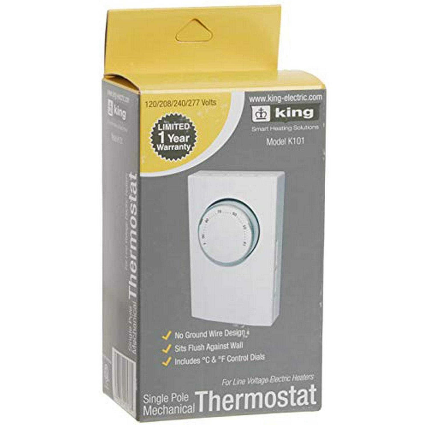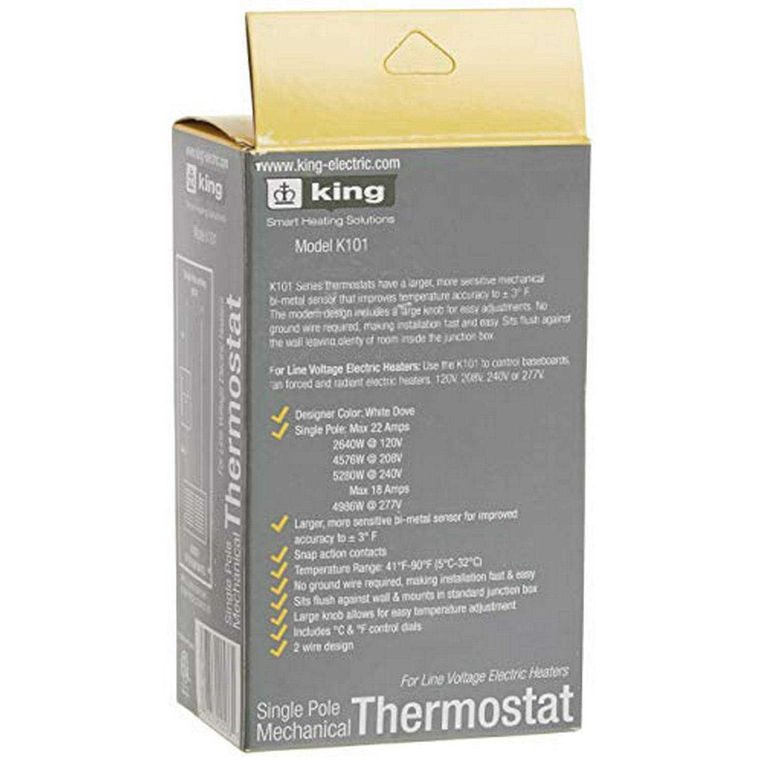 King Electrical 1-Pole Thermostat in white color has a bi-metal sensing element and operates in the range of 41 to 90 deg F. It works with a supply voltage of 120/208/240/277 Volts and is rated at 22 Amps. It has a maximum power rating of 5280 Watts. It has a clean, beveled style that suits any decor and can be flush mounted directly to a 2 Inch x 4 Inch vertical electrical outlet box. It has deg C/deg F control dials and senses air in all directions with a fully vented cover. Wall mountable thermostat is designed for use with line voltage electric heaters. Temperatures are easily adjusted with a large knob with an accuracy of +/- 3 deg F.