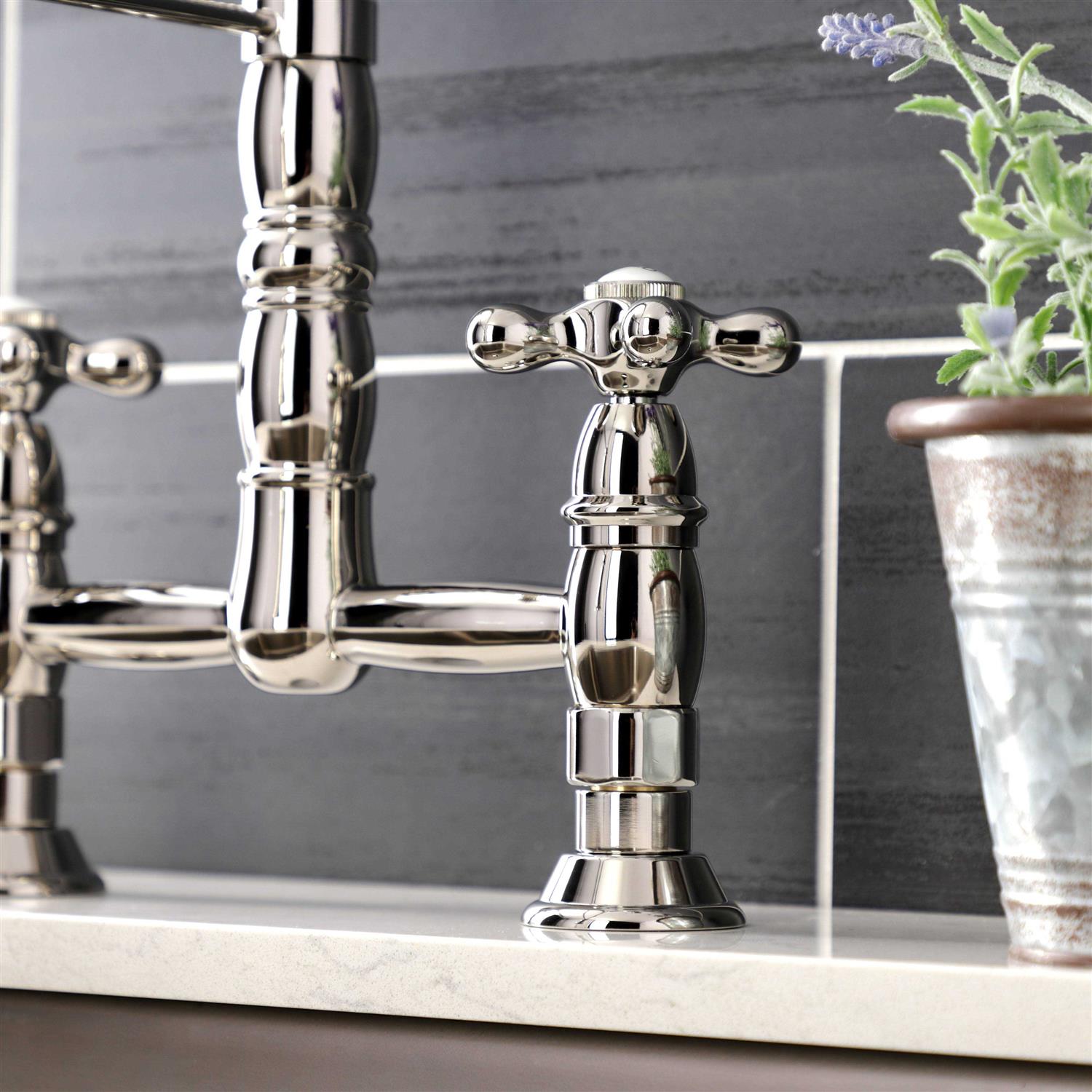 A lavish spark of traditionally stylized glamour is brought to your kitchen ensemble with this beautiful faucet. The Heritage two-handle deck-mount pull-down sprayer kitchen faucet combines elements of both classical design and modern day technology for an enjoyable and optimum dishwashing experience. It features a high arching spout to easily clean larger dishes, swivel ability to reach any area in and around your sink, and a dual function pull-down sprayer to tackle tough messes. Matching accessories are available for use.