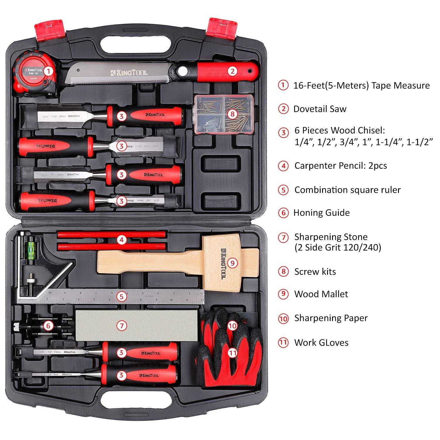 【Upgraded Version Of Wood Chisel Set】6x chisels 1/4″, 1/2″, 3/4″, 1″, 1-1/4″, 1-1/2″ (6mm, 13mm, 19mm, 25mm, 32mm, 38mm), 1x honing guide, 1x sharpening stone (120/200 grit), 1x 7-1/4-Inch Dovetail Saw, 1x Wooden Mallet, 1x 16-Feet(5-Meters) Tape Measure, 1x Combination Square Ruler, Screw Kits, 2x Carpenter Pencil, 1x Work Gloves, Sharpening Papers. Housed in a large deluxe tool box for easy tool storage and portability. Its sturdy interior and organizer keeps tools in place. 【6 Pieces Heat Treaded Cr-V Woodworking Chisels】*Large strike cap withstands repetitive hammer strikes, a wood mallet is in the wood chisel set. *Ergonomic handles with ProTouch Grips are durable enough to withstand jobsite abuse. *High quality hardened steel blade for superior performance and edge retention. 【Exquisite and Practical Dovetail Saw】Designed for fine woodworking,KINGTOOL Dovetail Saw is great for interior trim work and detailed work around windows. The flexible blade is also great for making flush cuts on dowels. This pull saw features a polymer handle that gives a comfortable, stable grip, even during long sessions. 【Honing Guide & Sharpening Stone】Chisels will need sharpening to ensure maximum performance.These marples chisel sharpener tool set are suitable for wood chisel, planer, blade, graver, carving knife, plane iron, flat chisel edge sharpening. 【Domestic and Professional Use】KINGTOOL wood chisel sets are suitable for amateur and professional carpenter or wood work artist woodworking jobs. The combination Square Ruler, lightweight-durable 16 Feet Tpae Measure and other accessories will add points to your work.Also this garage organization is perfect for Father’s Day, and is a great option as gift for Dad, Boyfriend, Man & Brothers. 87pcs Premium Wood Chisel Set, 6pcs Wood Chisel with 1 Honing Guide, 1 Sharpening Stone,1 Combination square ruler,work glove,