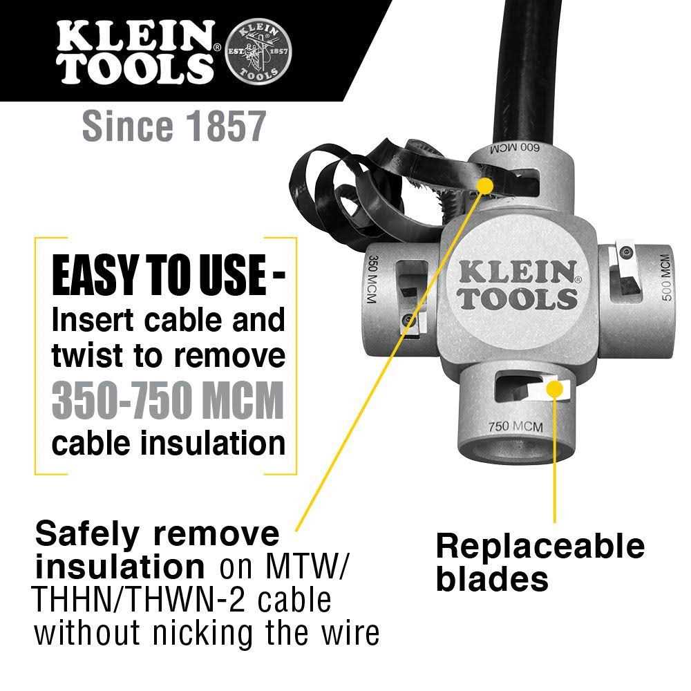 A quick and effective tool to cleanly remove the insulation on MTW/THHN/THWN-2 cable without nicking the wire. Clover design features four different sizes (350, 500, 600 and 750 MCM) in one tool. Simply insert the cable and twist for precise, clean cuts. The robust design ensures long tool life. Stripping cables has never been easier and safer.WARNING Always wear approved eye protection. NOT insulated. Plastic-dipped or slip-on plastic handles are NOT intended for protection against electrical shock.
