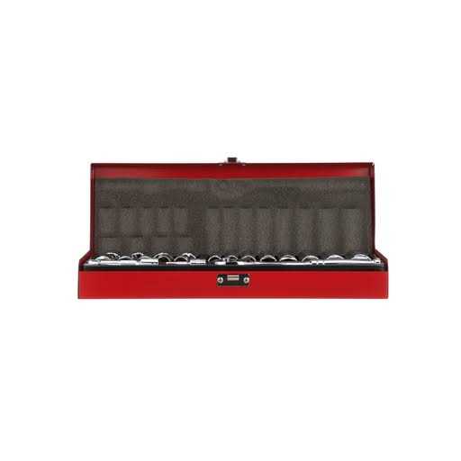 The socket set includes 17 sockets with chrome plating to prevent corrosion, plus 2 extensions and a ratchet. Each socket is engraved with its size for easy identification.