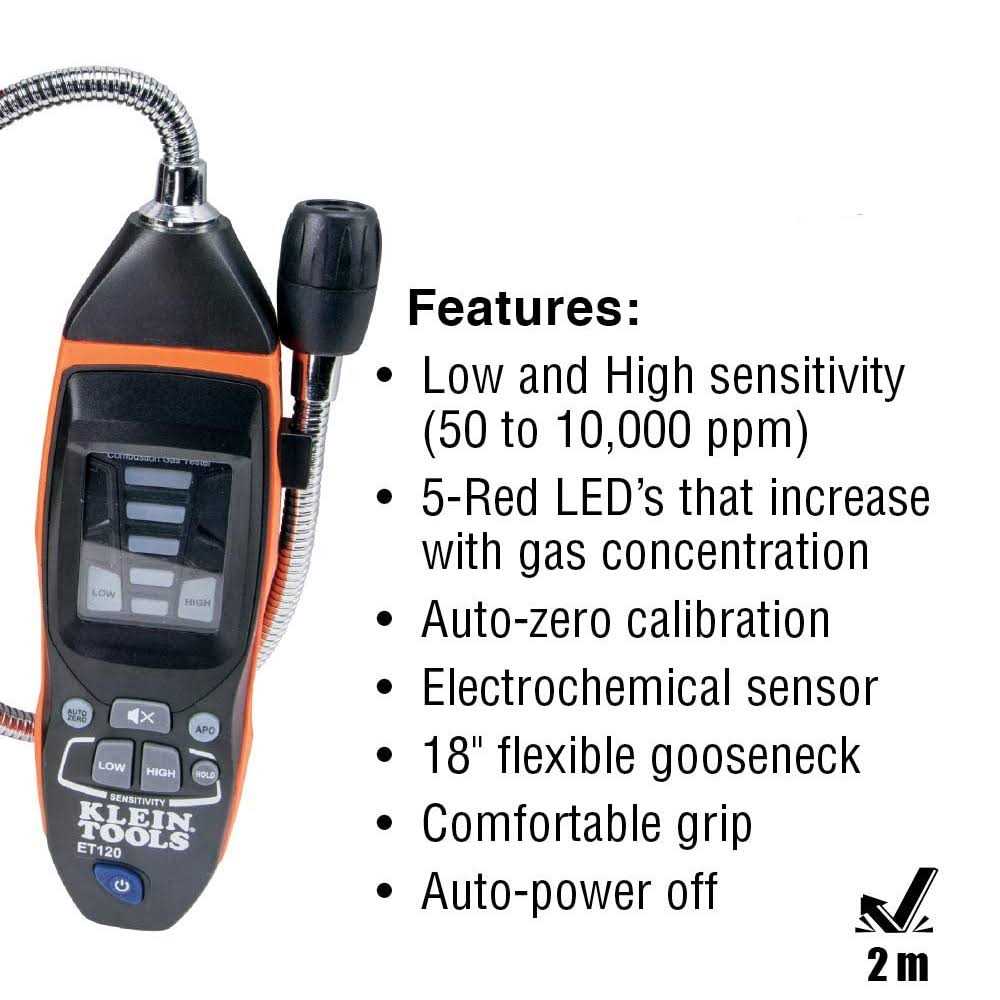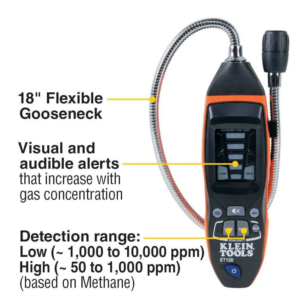 The Klein Tools Combustible Gas Leak Detector is the perfect choice for HVAC professionals. The ET120 is an easy-to-use tester that provides audible and visual alarms in the presence of methane propane and other combustible gases at concentrations as low as 50 ppm. It includes the detector 4xAAA batteries instruction manual and storage pouch.