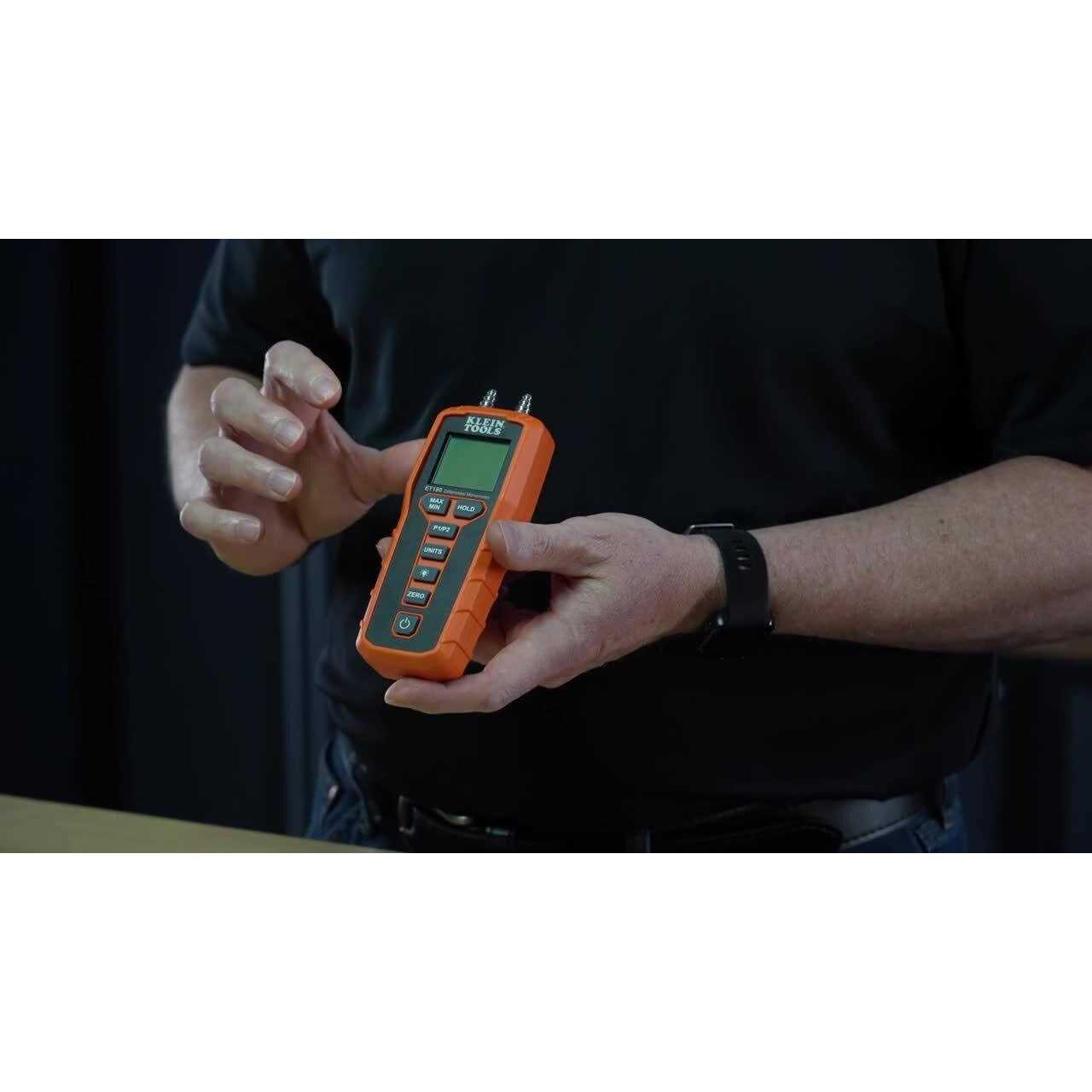 The Klein Tools ET180 is a digital differential pressure manometer to measure static and differential pressure from two ports in air and gas systems. The Klein Tools ET180 measures gas pressure up to +/- 60 WC with a full-scale accuracy of +/- 1.5% to help monitor and troubleshoot problems in HVAC systems.