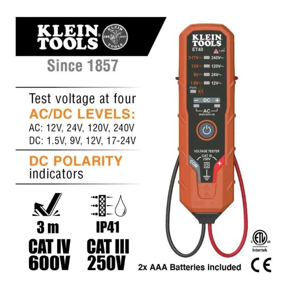 This electrical tester set includes a Circuit Breaker Finder (Cat. No. ET310) and a Voltage Tester (Cat. No. ET40). The ET310 Circuit Breaker Finder with Integrated GFCI Outlet Tester is a digital circuit breaker finder used to locate the correct circuit breaker in a panel to which an electrical outlet or fixture is connected. The Transmitter is connected to the electrical outlet or fixture in the circuit while the receiver is used to scan the breakers in the circuit panel. The Transmitter also features a GFCI outlet tester. Klein Tools ET40 is an Electronic AC/DC Voltage Tester. It features indicators for positive and negative DC polarity, and tests DC voltages as low as 1.5V. It tests AC voltages 12-240VAC. Excellent for checking, verifying or troubleshooting common residential electrical wiring in electrical outlets, light fixtures, doorbells and more. It operates on 2 x AAA batteries.