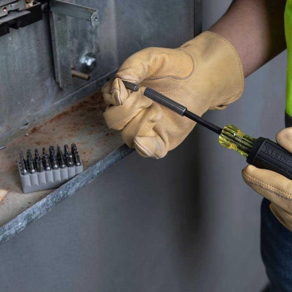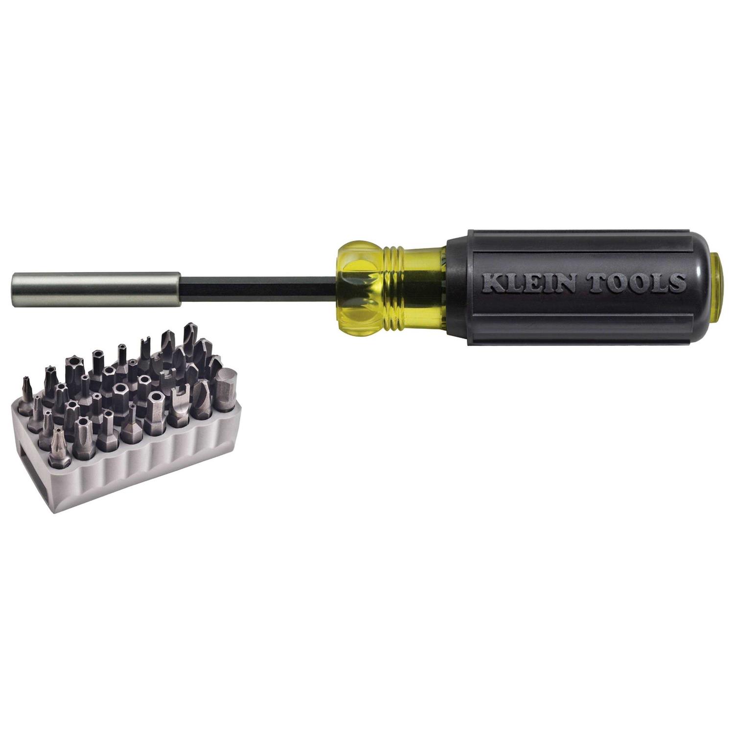 The Klein Tools Magnetic Screwdriver Set with 32 pieces provides tamperproof reliability and the flexibility to tackle a variety of jobs. A Cushion-Grip handle offers greater torque and comfort while the industrial strength steel bits lend long-lasting durability. For added convenience, a gray PVC storage block is included for trouble-free bit storage.WARNING Always wear approved eye protection. Do NOT use to pry or chisel. NOT insulated. Will NOT protect against electrical shock. NOT insulated. Will NOT protect against electrical shock.